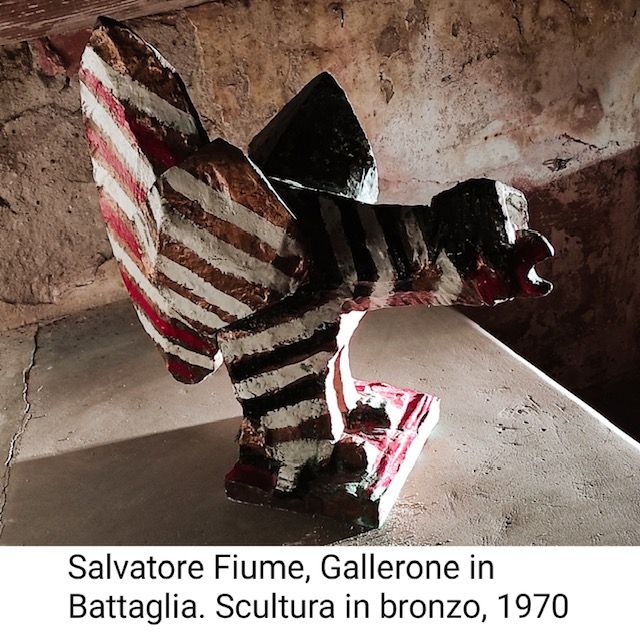 Ne nasce un leggero senso di inquietudine, quasi una metafora della fragilità della vita. Molto interessanti anche le fascinose impressioni dello spazio fluttuante di Attila Szücs, le creazioni in materiale povero, a cui si danno nuovi significati, di Bruna Esposito, i singolari collages di Frankling Evans, l’originale arte concettuale di Federico Luger oltre ai coinvolgenti e coloratissimi “Inni alla natura e agli animali” di Carlos Alvarez Las Heras. Ha entusiasmato la galleria MUPA, anche grazie alla preziosa disponibilità del presidente Daniele Crippa che ci ha accompagnato durante il percorso. È stata una bella sorpresa ammirare le stupende sculture in bronzo di Salvatore Fiume, quali il “Gallerone in Battaglia”, la “Donna candelabro”, l’ “Indossatrice” e, omaggio nostalgico al ricordo delle tavole imbandite che si svolgevano nel castello ai tempi del Gualino, la “Saliera Principesca” in bronzo. Ed anche “La Sfinge” di Ottone Rosai, una delle poche sculture dell’artista, famoso soprattutto per i dipinti. Appariscente la luminosa “Evita” di Marco Lodola e di spirito dadaista il bronzo la “Prudenza quando giochi con Bacco” del versatile artista Paolo Menon.