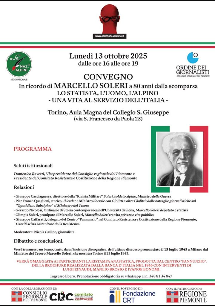 Lunedì 13 ottobre alle ore 16 il Centro “Pannunzio” organizza al Collegio S. Giuseppe in via S. Francesco da Paola 23, un convegno dal titolo: “Marcello Soleri a 80 anni dalla scomparsa. Lo statista, l’uomo, l’alpino: una vita al servizio dell’Italia“, in cui verrà ricordato l’antifascista ed il Ministro che, tra l’altro, salvò la lira dopo il disastro della 2^ guerra mondiale. Parteciperanno Domenico Ravetti ,Antonio Patuelli, Giuseppe Cacciaguerra, Pier Franco Quaglieni, Gerardo Nicolosi, Olimpia Soleri, Giuseppe Caffaratti. Modererà il giornalista Nicola Gallino. Con il contributo del Comitato Resistenza e Costituzione ed il patrocinio della Regione Piemonte, dell’Ordine regionale dei Giornalisti e dall’Associazione Nazionale Alpini. Il convegno sarà aperto dal suono dell’Inno Nazionale.