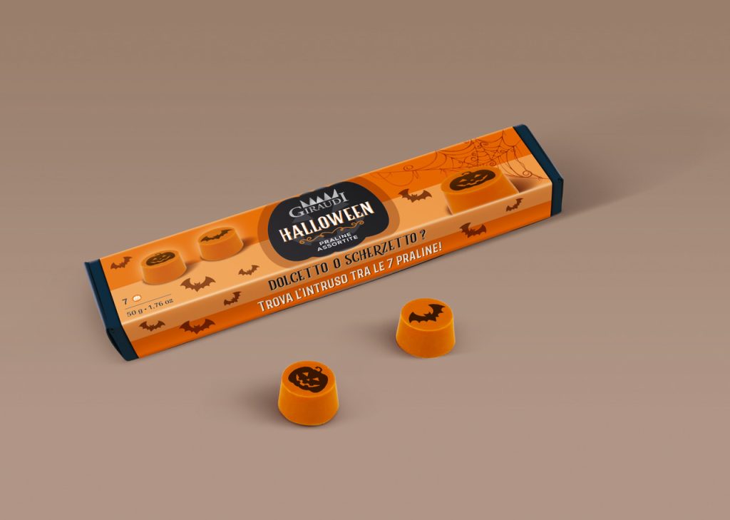Anche la Giraudi, rinomata cioccolateria artigianale di Castellazzo Bormida, in provincia di Alessandria, ma raggiungibile sul suo sito di ecommerce ed in tanti negozi torinesi, propone una gamma di praline speciali per Halloween. La confezione dedicata alla ricorrenza contiene 7 praline ed è pensata per coniugare divertimento e golosità. Tra le praline dal guscio di cioccolato all’arancia e cuori al pistacchio e al Gianduia, si nasconde, infatti, un intruso misterioso. Una pralina pronta a stupire con un ripieno scoppiettante che regala un’esperienza sensoriale inaspettata e divertente.