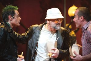 Deve aver scombussolato mica male gli animi e gli stomaci degli impettiti inglese il trentacinquenne Harold Pinter quando nel giugno del ’65 all’Aldwych Theatre presentò “Il ritorno a casa”, l’ultima delle sue “commedie della minaccia”, riversandovi battute secche e silenzi che dicono più delle parole, la crudeltà che serpeggia tra i personaggi e la voglia di primeggiare, anche con la violenza, l’uno sull’altro, non ultimo il padre, le rivalità che deflagrano, il vivere quotidiano che si fa lotta, inquietudini, rozzezza, voglia di emergere all’unico scopo di annientare gli altri. Ma quei silenzi non paiono interessare granché a Popolizio (altresì diversamente giovane in quel giubbino giallo occhiali e cappellino, gigione di prim’ordine, confezionatore di definizioni spicce per chi gli sta accanto – “frocio” per il fratello – o gli è stato – “puttana” per la moglie), lui ci gioca per riempirli di grandi movimenti, di quelli che alleggeriscono quando dovrebbero scendere più in profondità, cadendo nel grottesco e nel volgare, nel gratuito soprattutto, nell’assolutamente fuoviante (il fine è l’acchiappapubblico?): lavorando soprattutto sul Lenny di Christian La Rosa, bravissimo per carità, che si dimena, che sale e scende da quella dormeuse rossa e sbrindellata, che usa la voce alterandola e alternandola a falsetti e smorfie e sberleffi, quasi un Jim Carrey piombato dalla old London sul palcoscenico del Carignano, che sbatte in faccia allo spettatore la sua zazzera giallognola, ma Pinter non ci risulta questo, portato sulla strada della farsa (sospiri e gridolini a gogò disseminati per la scena), dove l’umorismo nero prende la faccia della risata grassa. Deborda Popolizio, anche la sopraffazione che circola tra gli umani e attraverso le stanze della casa non si fa commedia nera ma risata inconcludente. Ha lavorato anche sulla Ruth di Giorgia Solari, senza obbligarla a uscire da certe linee d’obbligo, il personaggio cresce con senno a poco a poco lungo l’intero arco dei 100 minuti, dalla semplice ragazza della porta (americana) accanto per farsi oggetto sessuale che sa come far girare il mondo.