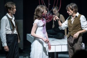 Prima di tutto lo spazio scenico dell’Astra (repliche sino al 30 novembre), chiuso nelle forme déco innalzate da Contardo Bonicelli, e oggi attraversato da qualche “rudere”, una nuova architettura, applaudito capolavoro d’invenzione dovuto al regista e a Luca Giovagnoli, in cui il pubblico, dopo il passaggio lungo uno stretto corridoio, è ospitato in uno sguardo nuovo, completamente diverso da come sino a oggi abbiamo potuto vedere le pareti e una platea, oggi scoprendo finestre da cui traspirano i raggi della luna e l’ammonticchiarsi delle solite sedute che, ancora oggi possono soddisfare i movimenti in verticale del nuovo principe delle tenebre, sino a spingerci verso l’alto, un altissimo sconosciuto, sino ai graticci che arruffano le urla e la disperazione di una voce umana. Ci ritroviamo da un lato che per tutti gli altri spettacoli è la scena degli attori, guardiamo con uno sguardo stranito e sghembo ma pieno di una curiosità che diventa a poco a poco passione, veniamo incapsulati in tutta questa oscurità a cui le luci di Pasquale Mari offrono sciabolate o coni o zone di fredda luce. Un uso dello spazio che convince appieno nella propria invenzione, una sorta di girone infernale, luogo di corse a perdifiato e di gemiti e di sospiri, di narrazioni ansimanti e di ricerca d’amore, alla luce fievole di quei candelabri che sarebbero piaciuti a Coppola – ma le livide atmosfere ci avvicinano anche all’opera di Murnau (non ci stupiremmo veder saltar fuori una macchina da presa a filmare terrore e slanci e urla); uno spazio pronto a farsi gabinetto medico e vasi autoptici, su uno di essi è già adagiato il corpo di una ragazza e un grande cuore rosso, che s’anima in quegli otto filamenti che salgono e scendono, attraverso cui passa il sangue angosciato e vivifico di Mina. Compresi i battiti che fanno parte della colonna sonora costruita da G.U.P. Alcaro (“un suono ferroso, ruvido e livido”). Un efficace barocchismo strettamente intrecciato con il gotico nero della vicenda – un susseguirsi di monologhi che creano alta poesia – che si perde nella storia e nella letteratura, nelle credenze popolari e nei racconti di un tempo.