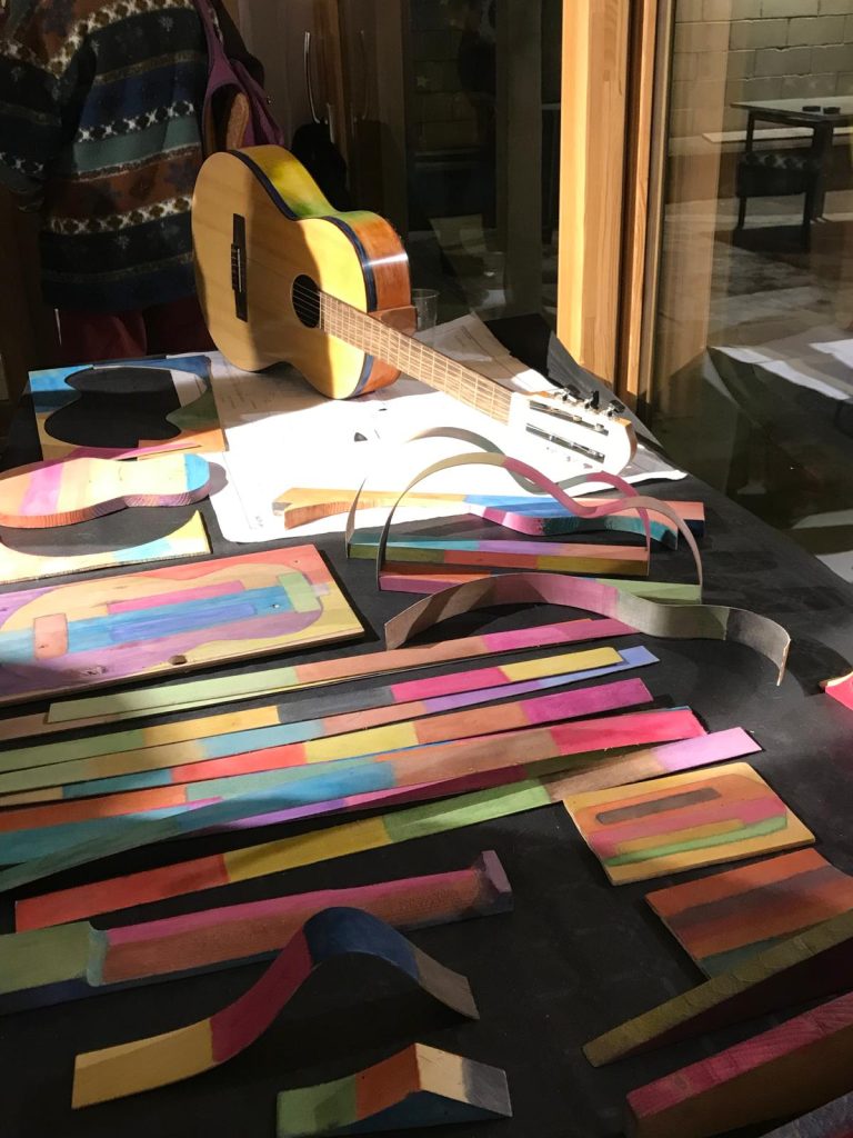 Scrive bene Anna Maria Borgna: “Michele si avventura nel mondo della pittura con l’audacia di un nuotatore nel suo elemento: cattura e domina lo spazio, traccia con forza le forme e accosta con intensità i colori preferiti (tra cui il viola, il giallo e il rosso) usando a volte pastose materie, a volte colori ad acqua trasparenti, lasciandosi andare a pennellate rapide o lente e morbide, oppure aggredendo il foglio con segni graffianti di spatola, fino a che non è appagato dal risultato”. E fa capolino un po’ di qua e un po’ di là. Del resto, i campi su cui correre e agguantare la lunga scala che porta alla “luna” sono tanti. E inaspettati. Fra i lavori in legno di geometrica, astratta spazialità, notiamo anche una “chitarra classica”. Un lavoro a quattro mani magnificamente realizzato insieme all’amico – fraterno Andrea Albrile, fra i massimi “passionate luthiers” di Torino, che racconta: “Il legno gioca con i colori così come l’arte di Michele incontra la mia passione per la liuteria … E proprio per gioco, attraverso questi anni, ci siamo divertiti a dare nuova vita a ritagli e forme, a capovolgere i cosiddetti errori e scarti di lavorazione … fino all’incontro dei nostri due mondi nella chitarra classica esposta in mostra”.
