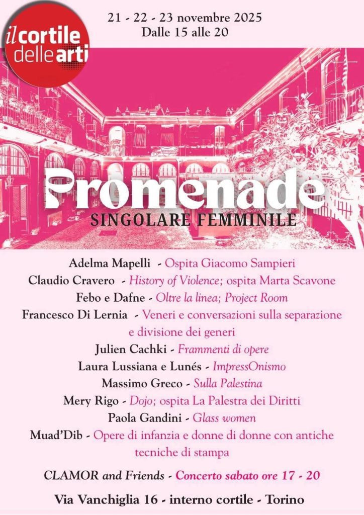 In vista ed in occasione della “Giornata Internazionale per l’eliminazione della violenza contro le donne 2025” del 25 novembre, al “Cortile delle Arti” di via Vanchiglia, all’interno del civico numero 16, si svolgerà venerdì, sabato e domenica l’iniziativa “Promenade – Singolare femminile” con tutti gli atelier e le gallerie d’arte aperti al pubblico sino a sera. Sempre dal 21 al 23 novembre, alla Galleria “Febo e Dafne” sarà possibile visitare il progetto fotografico di Daniele Robotti e Cinzia Spriano: “Oltre il silenzio – Storie di donne che sono uscite da situazioni di violenza in famiglia”