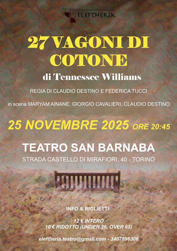 In occasione della giornata contro la violenza sulle donne, la  Compagnia Teatrale Elefthería porta in scena l’intenso dramma 27 vagoni di cotone di Tennessee Williams. Appuntamento il 25 novembre 2025 alle 20.45 al Teatro San Barnaba, con la regia di Claudio Destino e Federica Tucci.