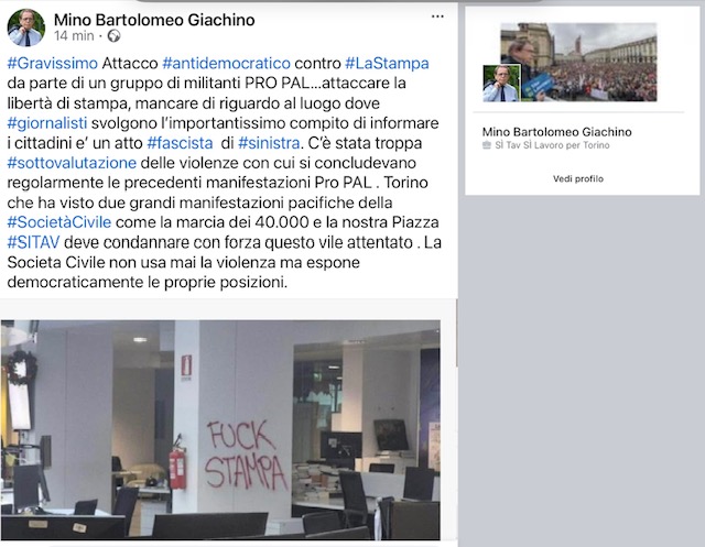 Il post pubblicato su Facebook dal neocommissario cittadino UDC di Torino, Mino Giachino, sull’attacco al quotidiano “La Stampa” da parte di dimostranti pro Gaza