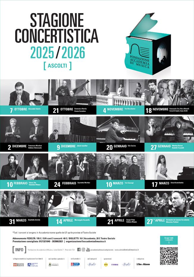 Il 2026 si apre martedì 20 gennaio con Elia Cecino, pluripremiato pianista italiano dell’ultima generazione e primo italiano vincitore del Concorso “Iturbi” di Valencia; si prosegue poi martedì 27 gennaio con il duo formato dalla mezzosoprano Martina Baroni, solista alla Deutsche Oper Berline il pianista Rodolfo Focarelli; ancora un duo, questa volta composto da violino e pianoforte sarà di scena martedì 10 febbraio quando, sul palco dell’Accademia, saliranno Simon Zhu, violinista che da giovanissimo ha conquistato il Premio Paganini di Genova, e Valentina Messa,una delle cameriste più interessanti della sua generazione. Si prosegue martedì 24 febbraio con il Quartetto Werther, tra le formazioni cameristiche più promettenti del panorama concertistico nazionale e internazionale, uno degli ensemble più rappresentativi tra quelli premiati all’International Chamber Music Competition “Pinerolo e Torino Città Metropolitana”, progetto della Fondazione Accademia di Musica. Martedì 10 marzo sarà la volta del Trio Concept (già Trio Chagall), giovane formazione italiana cresciuta in Accademia che continua a mietere successi internazionali, ultimo in ordine di tempo è la nomina ECHO Rising Star. Martedì 17 marzo si esibirà Anna Kravtchenko, già Premio Busoni, definita dal New York Times pianista carismatica dal “suono luminoso e dalle poetiche interpretazioni che possono portare l’ascoltatore alle lacrime”. Il mese di marzo si chiude martedì 31 con il Quartetto Armida, già Primo Premio al prestigioso concorso ARD di Monaco e gruppo di punta della musica da camera internazionale. Si prosegue martedì 14 aprile con un evento d’eccezione:“Chopin op. 10: Gravity”, programma originale e innovativo ideato da Mariangela Vacatello, una delle artiste più affermate del panorama internazionale che, nella sua carriera, ha ottenuto riconoscimenti nei principali concorsi pianistici quali il Busoni di Bolzano, il Liszt di Utrecht e il Van Cliburn in Texas. Martedì 21 aprile di scena è il duo formato da Sergio Pires, primo clarinetto solista della Winterthur Musik Kollegium nonché della London Symphony Orchestra,e dal brillante pianista Stefano Musso. La Stagione si conclude lunedì 27 aprile sul palco, questa volta, del Teatro Sociale di Pinerolo con l’Orchestra da Camera Accademia, fiore all’occhiello dei progetti artistico didattici dell’istituzione pinerolese, guidati in questa occasione da Massimo Polidori, uno degli artisti più completi della sua generazione.