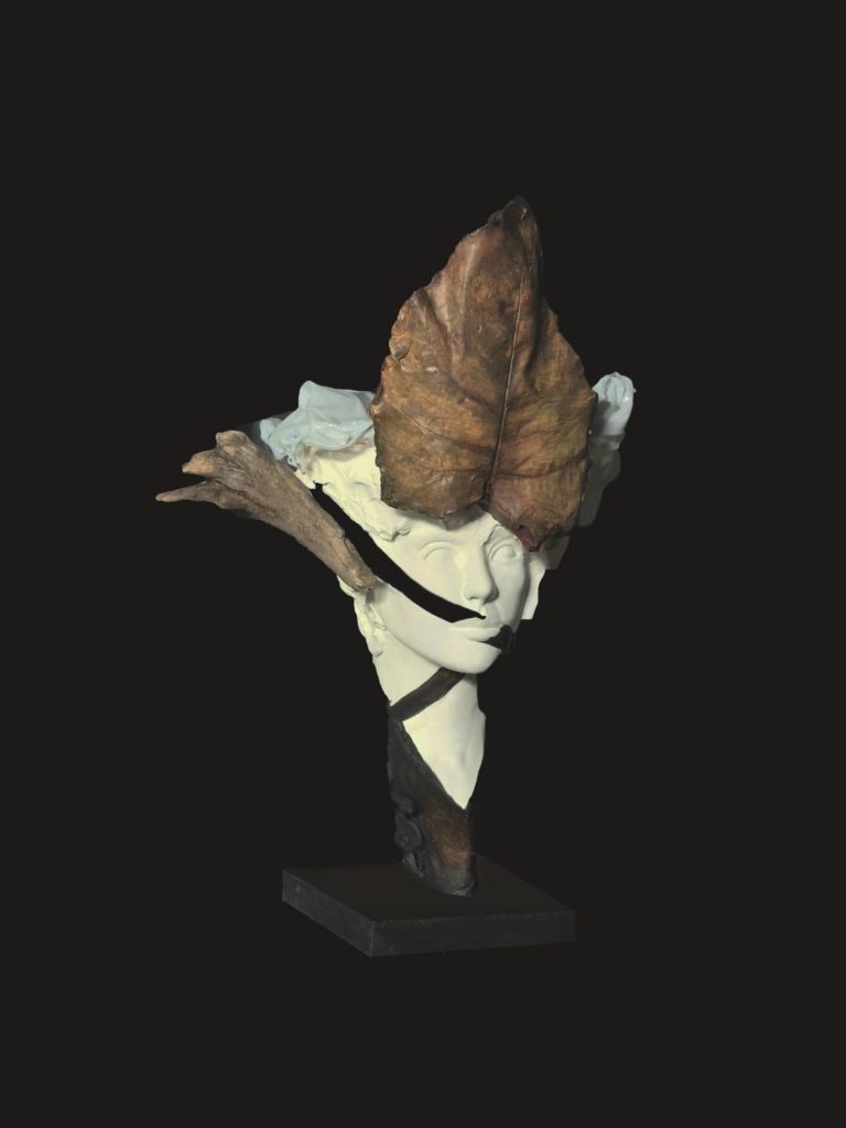 Dalla classicità parte e s’avventura Cesare Iezzi – nativo di Chieti, premio artistico Giuliano Nozzoli 2024 -, dal mondo greco e rinascimentale, dalla perfezione dell’oggetto, dalla conclamata bellezza dell’esecuzione, colma di partecipazione e di misura, nel chiarore del bianco dell’elemento principe, abbinando di volta in volta gesso, pvc, luce e legno marino, di differenti altezze, attraversando maschere dai nomi inusitati come Medeine (2023, in un perfetto gioco di materiale naturale e di tratti oscuri che paiono deturparle il volto), Anakin, Inanna, Poseidon (2023, quasi un sfinge, mentre i capelli scomposti gli nascondono parte dello sguardo), Euterpe (dall’ampiezza frontale, dallo studiato svolazzo di copricapo e di abito, 2025), Harnauta (forse una cecità che soltanto una luce azzurrognola può disperdere, 2023), Halcestis (lo sguardo rivolto all’alto nella propria immolazione di tragedia, assorto o indagatore, 2022), Sarepide, tra mitologia e letteratura e sogno. Calde espressività e movimento vivificato dalla luce posta all’interno di copricapi dal sapore quattrocentesco e fiammingo, che riportano lo spettatore a un ampio tratto di Storia, entrambi costruttori di quella forte energia che scaturisce dall’opera. Un tempo antico, che piace qui ritrovare (ma lontano dal rétro e dalla nostalgia), dove gli inserti lignei accrescono e fortificano un’età, una ricerca in più, un confronto maggiore con il passato dei vecchi capolavori e dove la lampada inserita, che finisce con l’avvolgere da questo o da quell’altro lato, da un elemento in più che piomba dall’alto e rivela a poco a poco i tratti sottostanti, mostra una bellezza dai tratti femminili, dove ogni piega diventa poesia, tratti sospesi nella memoria, nella spiritualità di ognuno. Tratti perfetti ravvicinati a qualcosa di incompiuto ma egualmente vibrante, sinfonia di guance e di bocche che esprime sentimenti, emozioni, sguardi lontani e imperscrutabili.