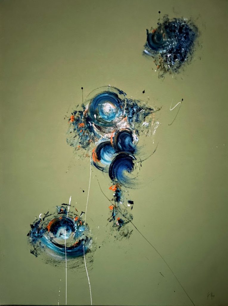 Graziano Rey – torinese, classe 1953, membro della “Soffitta macabra di Alessandri, dentro il mondo della pittura e della musica (sua la sigla di “Buona Domenica”, suo il premio “Rino Gaetano” 1991/92 come il premio Viareggio come cantautore: nonché opinionista per numerose puntate del “Maurizio Costanzo Show”) – poggia in maniera assai personale sulle proprie tele “un mondo di colori”, per estrema astrazione, di grande movimento e di forte impatto visivo, simpaticamente strambo e dinamico, variante e ritmato, grumi di colore che sono note posate in vario disordine su un frastagliato e scomposto rigo musicale; gioca in “frammenti di tela” con quelle che paiono coreografie costruite sulla tenuità dei colori, i rosati gli azzurri i grigi, insetti sconosciuti o gemme preziose ; o piccoli mondi in movimento; sogna e ondeggia con deboli profondità attraverso “Frammenti di blu” (2024), ovvero impercettibili sagome che paiono guardare ad accenni umani, piccoli e ormai cresciuti, oggetti che spetta a noi decifrare, in pieno sfondo di un giallo acceso, mentre tutt’intorno è calmo silenzio, un invito a considerare, a trattenersi un attimo, tra quanto può essere realtà e quanto diventa immediatamente sogno.