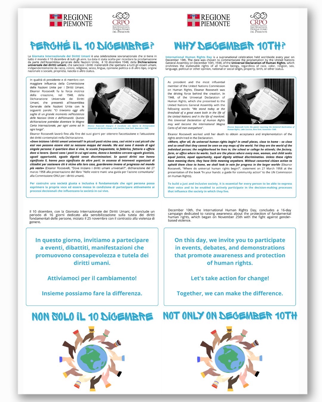 Nella ricorrenza del 10 dicembre riteniamo necessario consegnare e diffondere a tutti, ma soprattutto alle giovani generazioni, il testo della Dichiarazione universale dei diritti umani, in lingua italiana e inglese, con un messaggio inclusivo e potente.
