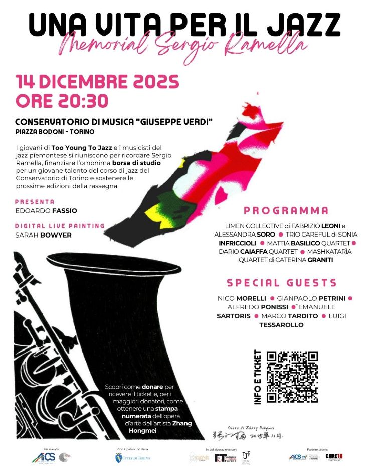 Domenica 14 dicembre dalle 20.30 al Conservatorio G. Verdi, concerto: “Una Vita per il Jazz” , Memorial Sergio Ramella, Concerto Benefit. Giunto alla seconda edizione, vuole ricordare la figura di Sergio Ramella, colui che da grande appassionato di jazz, ha portato a Torino e non solo i più grandi musicisti della storia del Jazz. I giovani di “To Young To Jazz” insieme ai musicisti del jazz piemontese, suoneranno oltre che per ricordare Ramella, anche per finanziare una borsa di studio per un giovane talento del corso di jazz al Conservatorio. La serata sarà presentata da Edoardo Fassio. Sul palco del conservatorio si alterneranno : Limen Collective di Fabrizio Leoni e Alessandro Soro, Trio Careful di Sonia Infriccioli, Mattia Basilico Quartet, Dario Caiffa Quartet, Mashkatarìa Quartet di Caterina Graniti. Special Guest : Nico Morelli, Gianpaolo Petrini, Alfredo Ponissi, Emanuele Sartoris, Marco Tardito, Luigi Tessarollo. L’ingresso è su donazione (a partire da 10 euro). Tutto il ricavato andrà a finanziare borse di studio per giovani musicisti e anche la rassegna To Young To Jazz.