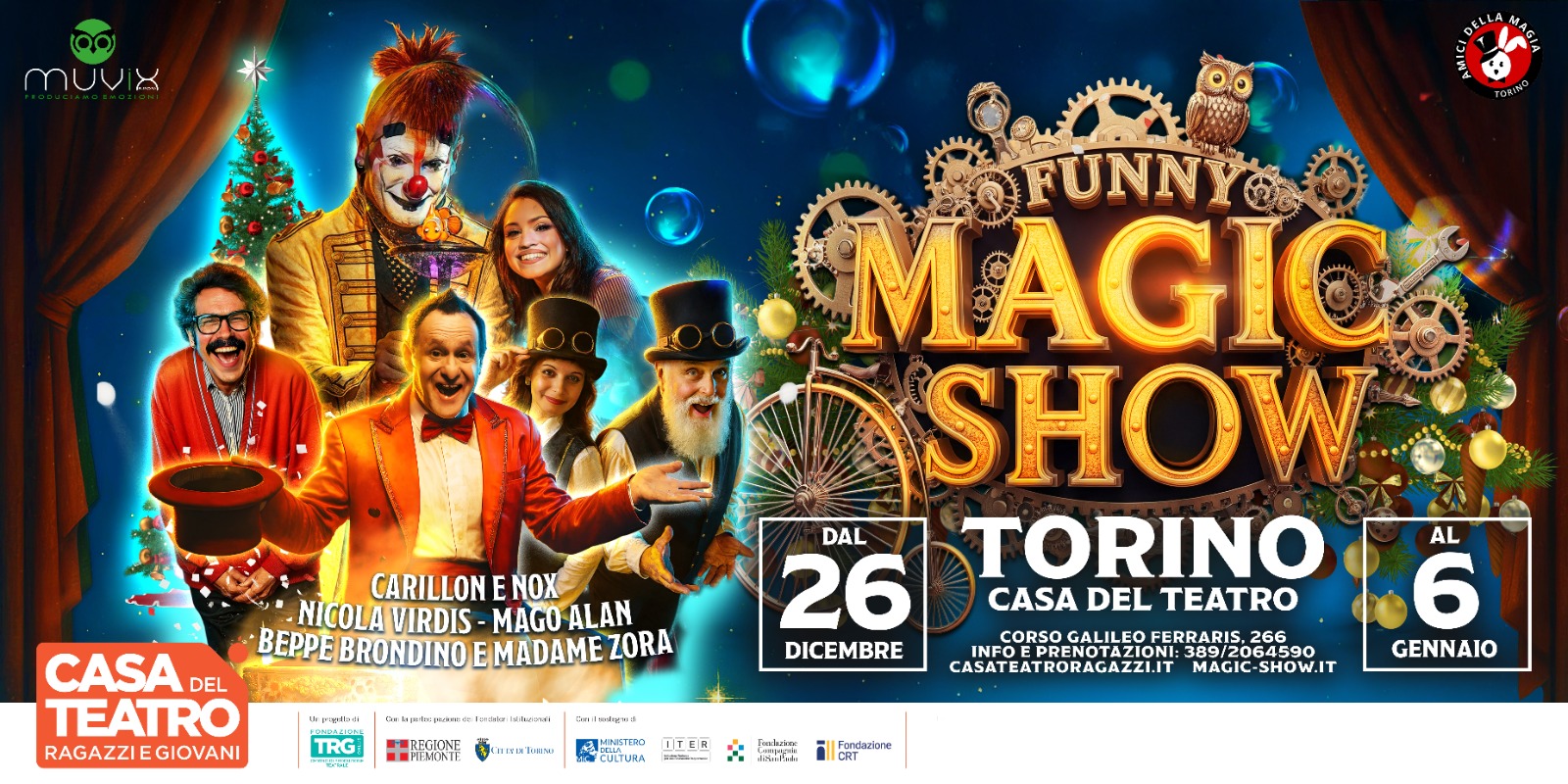 Alla Casa del Teatro di Torino, dal 26 dicembre al 6 gennaio prossimo, torna l’appuntamento con l’illusionismo con lo spettacolo “Funny Magic Show”, prodotto da Muvix Europa in collaborazione con il Circolo degli Amici della Magia di Torino, la più importante realtà di magia italiana, fucina di grandi nomi, quali Brachetti, Alexander e Luca Bono.
