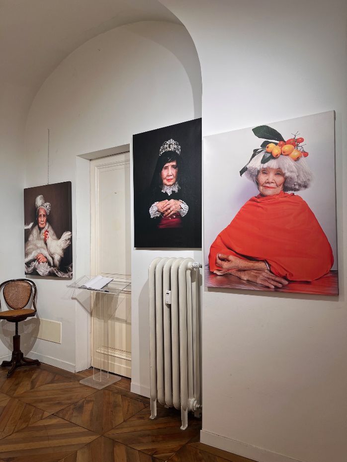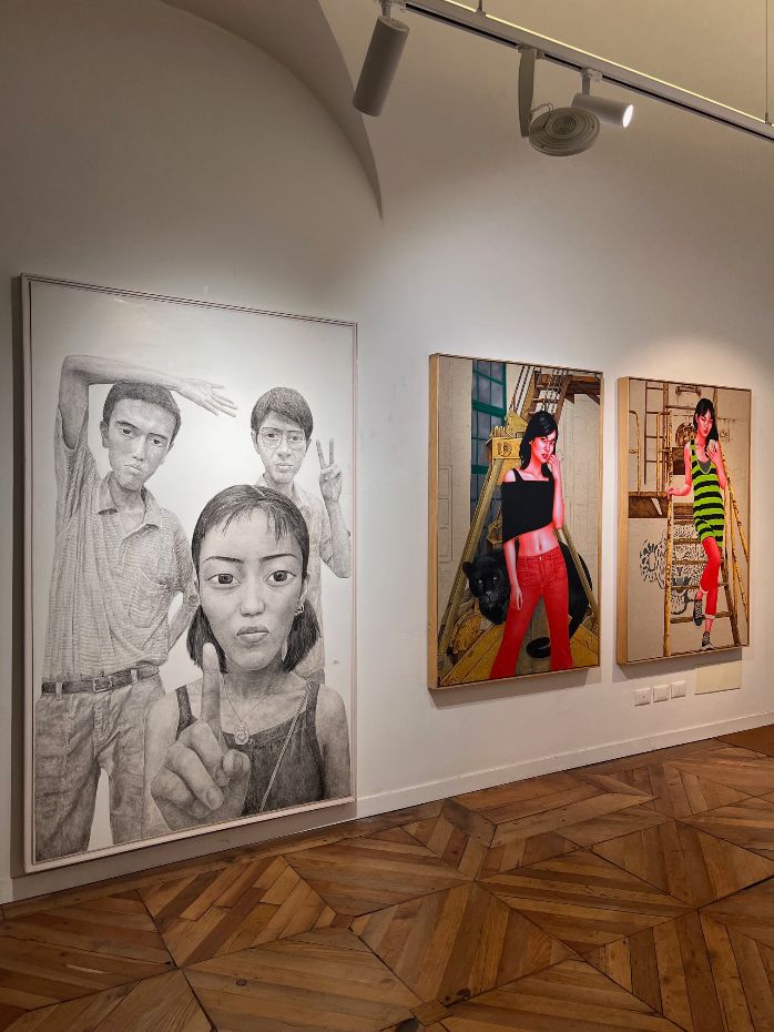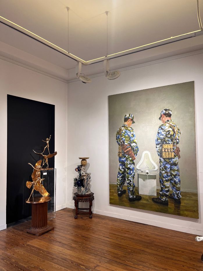 Quattro principali artisti, accomunati per lo meno dalla curiosità che coinvolge chi guarda, Xing Junqin, un ex militare che porta sfacciatamente e al colmo dell’ironia Duchamp tra due soldati in tuta mimetica intenti in un puro bisogno fisiologico (“The romance of Duchamp story”, 2006) o che sa costruire con estrema precisione, nel fitto degli alberi ricchi di fogliame, tra tinte verdi e marroni che riprendono l’abbigliamento militare, il suo “Paesaggio camouflage” (2006), elementi coraggiosi di grande impatto visivo. Zhang Hong Mei mette in campo preziosi “mental landscape” (2016), tessuti incollati su tela, accenni, stralci di paesaggi, macchie rivisitate brillantemente a creare scogli, angoli di mare, vele, miscelatura di materiali dove il colore s’impone, vivissimo, vissuto in piena libertà, tra pieni e improvvisi vuoti, come quello del 2017, un territorio che si frantuma, poco a poco, forse quello nordamericano, una deriva e una sparizione a due passi da noi. Soltanto nella mente? Per l’artista la pittura è anche capace di un ulteriore gioco, irreale, che si manifesta in un minuscolo “albero della fortuna” (2025), usando multicolori, giallo rosso verde, tessuti su fili d’acciaio. Come simili tessuti possono anche essere incollati sul bronzo e dare vita a curiose figure di dei o eroi, che non conosciamo. Xu De Qi realizza coloratissime e moderne figure di ragazze, selvagge e rampanti, pronte a imporsi, padrone di sé, vuoi che affrontino il mondo protette da una nera pantera, anch’esse aggressive (“Beauty and the beast”, 2019) o in discesa da un battello, fasciata da hotpants e canottierona a righe verdi e nere, questa volta avendo alle spalle la presenza di un non certo meno pericoloso felide (stesso titolo, 2024). Ancora l’iperrealismo di Luo Zhiyi, intenso e prezioso di tecnica, nella continua ricerca di particolari che certo affascinano. Senza contare le operazioni di autori quali l’ormai acclamato Ai Weiwei, tra tappezzerie e ceramiche dipinte a mano, o di Wu Dewu con la sua “Butterfly”, luminescente tra angosciosi omini in nero, o Ma Fengyun che regala tre ritratti in stampa digitale su tela di altrettante bizzarre ma impagabili vegliarde che valgono da sole una visita.