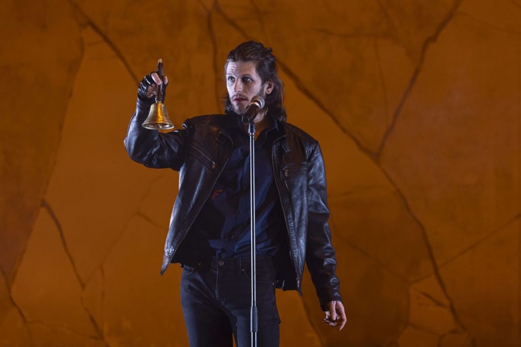 Oggi, in questa stagione teatrale – costruita per pensare in lungo – di sconvolgimenti che generano mostri (“forse il mostro è Testori, la cui parola diviene mostruosa perché non teme lo scandalo, anzi, lo cerca e lo provoca. Ma il mostro è anche la vita stessa, in un mondo in cui anche gli angeli possono sterminare”), TPE – Teatro Piemonte Europa in collaborazione con stabilemobile “pone” sul palcoscenico dell’Astra angeli e moto – nella spazio scenico spoglio di Giuseppe Stellato il fulcro è la marmitta di una moto che fuma – in un adattamento di Federico Bellini, per la sulfurea, fortemente immaginifica regia di Antonio Latella. Uno degli attori, mescolandosi tra noi spettatori, d’improvviso reclama la sua e la loro intenzione di non lasciarci abbandonare al divertimento, perché non ci sarà gioia ma lacrime e sangue. Tre attori quindi, un giovane motociclista che sbraita e vomita un rosario di scurrilità (Alfonso Genova), una cartomante (l’eccellente Matilde Vigna: ha davvero i tratti di Camilla Cederna, grande firma dell’”Espresso”, la sua cartomante?) che evoca defunti ed è tramite con il mondo dei vivi aggirandosi avvolta nel suo elegante abito rosso, un uomo che è un cronista (Francesco Manetti) e forse l’alter ego dell’autore incaricato – volteggia la sua penna immaginaria nel vuoto, più e più volte, con accanimento – di mettere ordine nei fatti e nelle morti che continuano a succedersi, magari per un libro che chissà se pubblicato, nell’ascolto della voce e dei deliri dolorosi della donna, dei suoi racconti e delle intuizioni a cui il suo gioco/professione dà origine: ma tutto accade velocemente, troppo velocemente, a tratti se ne perde – e ne perdiamo – il senso, la probabile ricostruzione, lo svolgimento ordinato che ognuno s’augurerebbe. Non è nelle intenzioni di Testori, è bandita ogni logica narrativa, Testori affastella brandelli d’azioni, frammenti di resoconti, parole rotte che si alternano a metallici suoni di campanelle, lampi di una memoria che non riesce – o forse assolutamente non vuole – a ricomporsi. Tutto nasce libero, tutto si sovrappone, i colori si mescolano. Si costruisce poco a poco una sorte di armageddon meneghino, di girone dantesco, ognuno a narrare la (propria) storia per bocca della donna, un assurdo e vorticoso giudizio universale che non ha eletti né condannati, una di quelle storie medievali di Morte viste in qualche affresco, dentro qualche chiesa o camposanto toscano.