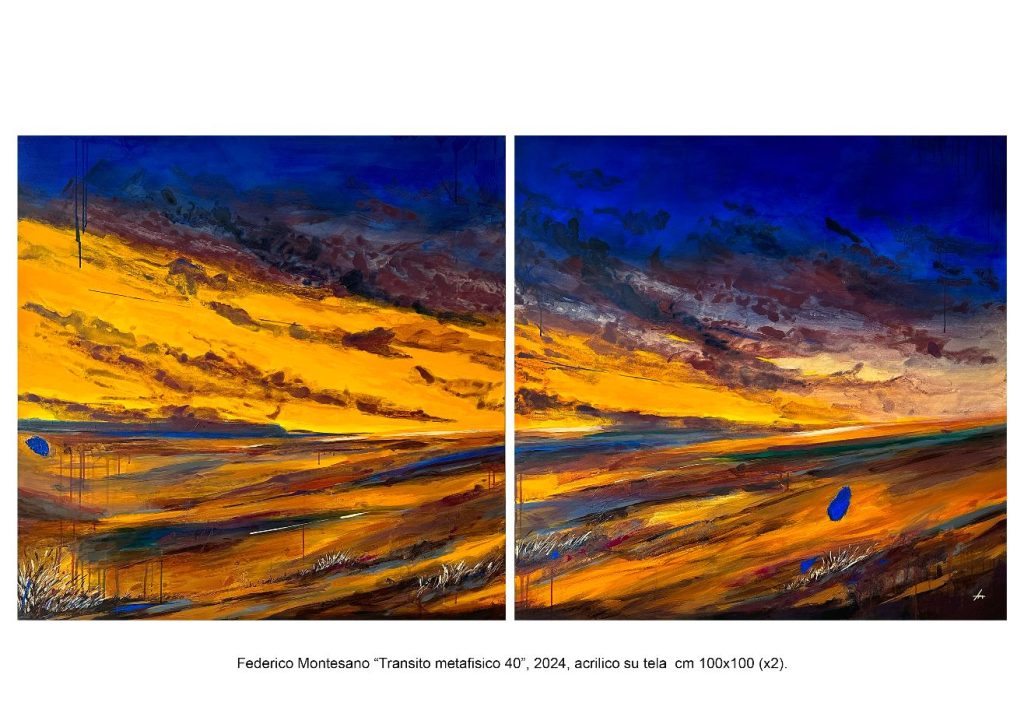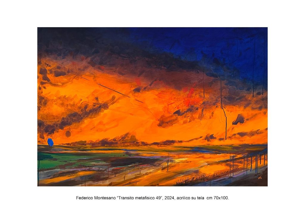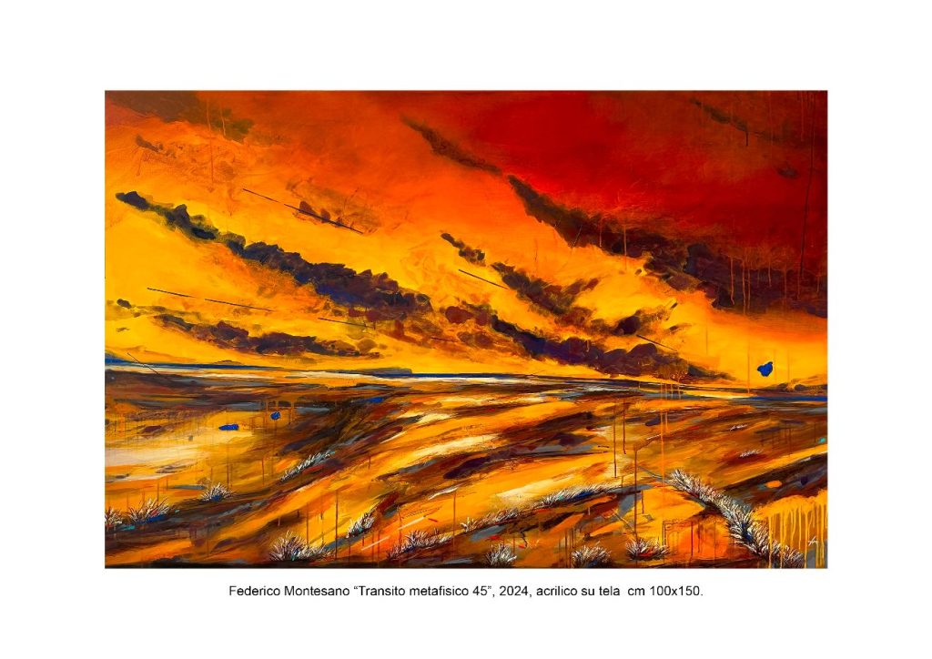 La sospensione di quali frammenti? Di una volta di cielo, che ricopre ogni cosa in quelle ampie dimensioni a cui l’artista non sfugge o rincantucciato in una più piccola porzione, di un universo e di un cielo che albeggi o si vada accendendo mentre il pomeriggio s’inoltra sino all’ultimo dentro le ombre della sera, nelle tele di Montesano lavorate con l’acrilico, che letteralmente ti invadono e rendono chi guarda – diciamolo subito, con vera ammirazione, per la maestria visibilissima, ad ogni attimo tangibile, della composizione, per la ricchezza e la solennità, per la strenua capacità nello studio del ravvicinare questo a quel colore, in una sorta di riuscita e orecchiabile musicalità: scende nello specifico Monia Malinpensa nel presentare l’artista: “colori gialli che si accendono al sole, verdi che respirano di speranza, rossi che ardono di passione, arancioni che custodiscono la memoria, dialogano con il blu profondo del cielo creando armonie di straordinaria intensità poetica” -, attimi che ci fanno andare con la memoria a quelli di grandi maestri del passato (certe distese o tempeste o cieli infuriati scelti dalla pittura di un paio di secoli or sono), per il magma cromatico che si espande irruente in tutto il suo ordine – partecipe di una pregnante materia, reale e favolistica allo stesso tempo, costruita d’ispirazione e di lirismo, che si offre alla narrazione altrui ma che, in quel suo costante avvolgerti, si rende forte nel tuo stesso intimo. Non è, in Montesano, soltanto il piacere di usare il colore e di padroneggiarlo, il pittore (a cui io credo possa ancora essere accomunato il termine “giovane”, con simpatia e rispetto, con la consapevolezza di quelli che oggi sono i suoi maturi traguardi) ti rende partecipe della sua opera e tu, immediatamente, senza ombre o tentennamenti, dai conferma. Che ti piacerebbe sottolineare appropriandoti ancora di più – quasi un’altra firma che si insinua nella tela, un tramite di più ampio respiro – di quelle macchie bluastre che sono il segno del pittore, immancabile, poste centrali o di lato, posate con il colore o con un’impercettibile materia di differente consistenza, quei tratteggi e quelle linee continue che formano inaspettati confini o ulteriori orizzonti, le leggere sovrapposizioni che la luce rada sulla tela lascia affiorare, le colature indifferenti che Montesano – con accorta libertà – disperde tra le sue pianure e gli orizzonti lontani, i grandi fiumi che corrono al mare, i cieli notturni e le tempeste e le spiagge, i “transiti metafisici” che trascorrono da un mondo ad un altro, caparbiamente, da quattro cinque anni a questa parte.