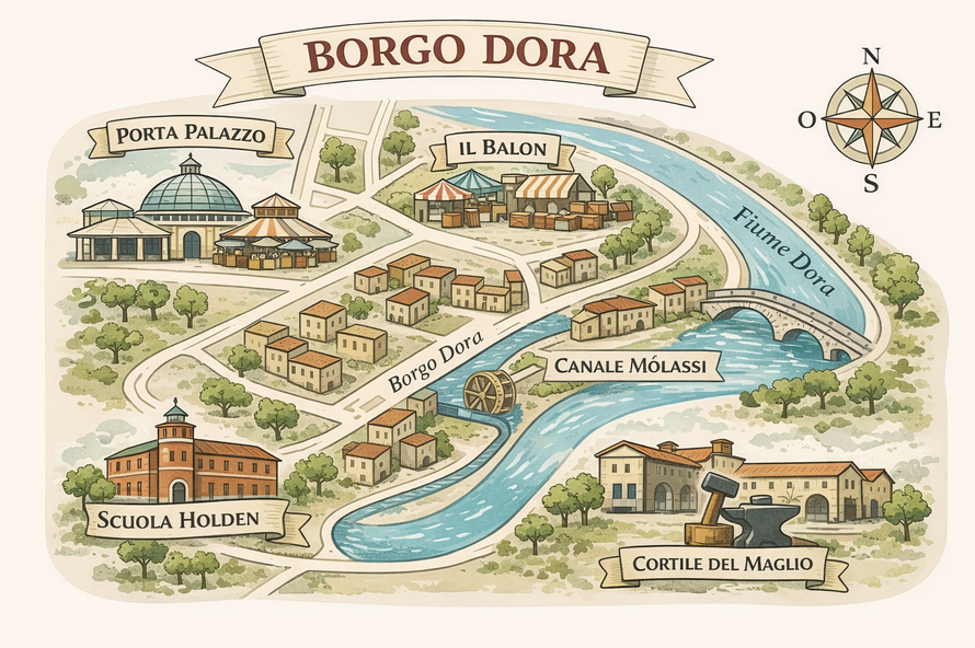 Nelle vicinanze, sotto le strutture del Mercato Centrale Torino, si conservano resti di antiche ghiacciaie ipogee, testimoni della Torino commerciale e poco distante ha sede la Scuola Holden, fondata da Alessandro Baricco, che costituisce un custode attuale a tutela della narrazione di un quartiere che è come un personaggio della città portatore di storie, di tracce di umanità e moderne abilità. Nel centro del Cortile del Maglio, parte dell’antico complesso legato all’Arsenale, campeggia ancora il maglio, strumento per lavorare il ferro; oggi, in questo spazio, hanno si organizzano eventi ed iniziative culturali. Borgo Dora, inoltre, è sempre stato un quartiere di passaggio e mescolanza: nell’800 accolse operai e migranti interni, nel 900 divenne una delle prime aree multiculturali della città; nelle sue strade si sentono accenti diversi con un’unica vocazione alla trasformazione e all’integrazione. Personaggi illustri come Cesare Lombroso, che studiò nei pressi del mercato le dinamiche delle classi marginali, ed Edmondo De Amicis, che descrisse nei suoi scritti la Torino più umilmente laboriosa, luogo ideale di effervescenza sociale, vissero questo borgo riconoscendone il carattere e le peculiarità.