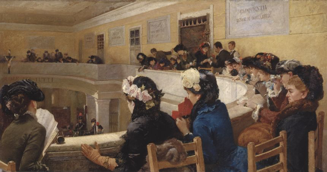 Nelle immagini, Francesco Netti, “In Corte d’Assise”, 1882, olio su tela, Bari, Pinacoteca; Pio Joris, “Circo Agonale (Piazza Navona)”, olio su tela, collezione privata; Angelo Morbelli – “In battello sul lago Maggiore”, 1915, olio su tela, collezione Fondazione Cariplo; Silvestro Lega – “La pittura (Isolina Cecchini)”, 1869, olio su tavola, collezione privata.