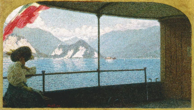 Il tempo libero occupa la quarta sezione, dove primeggia di Angelo Morbelli In battello sul lago Maggiore, del 1915, ancora un momento di calma prima che scoppi la bufera della guerra, uno scorcio fotograficamente interpretato a racchiudere in primissimo piano una signora che al riparo dal sole sta attraversando la distesa d’acqua, rappresentante di una nuova borghesia di rapida trasformazione alla ricerca dell’affermarsi di nuovi svaghi, come il viaggio e la vacanza che a poco a poco andavano a sostituire la villeggiatura trascorsa nelle proprietà di mare o di campagna. È la nascita della Belle Epoque, delle stazioni termali con gli hotel di lusso che si possono più facilmente raggiungere grazie ai moderni mezzi di trasporto. È l’epoca in cui la donna – alcune donne, quelle che appartengono alle classi più abbienti – cercano di ritagliare per se stesse un posto discreto ma ben definito all’interno della società e dei fermenti che l’accompagnano: s’affidano al loro gusto e con Carpanetto diventano Critici gentili forse a dare il loro assenso nello studio del pittore a un’opera che esse stesse hanno commissionato o con Lega, che ci tramanda il viso della modella e allieva Isolina Cecchini, tentano La pittura o scoprono il turismo con grande interesse per la scoperta dei tanti itinerari (Alberto Rossi, Il Baedeker, Venezia, non si sa se più ossequioso o critico). Mentre altre ci restituiscono infelicità e sfruttamento, debolezze e classi meno abbienti, prostituzione (una ricerca per Morbelli, tra il 1884 e l’87, un linguaggio fatto di severità e crudezza verso una denuncia che guarda a una dilagante realtà, forse disteso “in un racconto altrettanto drammatico, ma nel quale la raffinatezza tecnica divisionista e quindi la luce, caricano l’immagine di una valenza psicologicamente ed emotivamente più sottile e inquieta”) e lavoro minorile (di Longoni La piscinina, 1890, all’uscita da una sartoria per presentare alla signora l’abito ordinato), piaghe che erano un contraltare non indifferente a quell’aria di festa e di speranza che inevitabilmente circolava all’indomani dell’Unità.