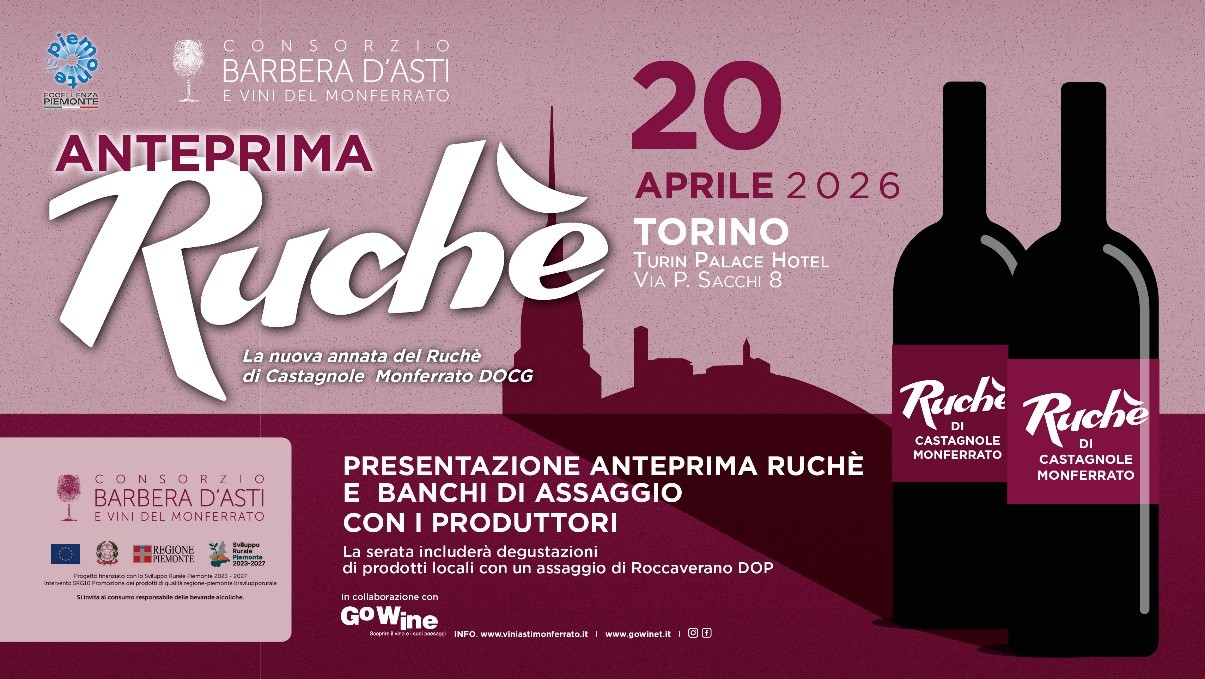 Il Consorzio Barbera d’Asti e Vini del Monferrato promuove a Torino in collaborazione con Go Wine un evento dedicato alla presentazione, in anteprima, del Ruchè di Castagnole Monferrato Docg 2025 presso l’Hotel Turin Palace in Via Paolo Sacchi 8 a Torino.