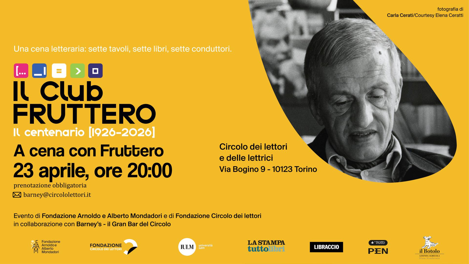 In occasione del vernissage de Il Club Fruttero. La mostra, la Fondazione Arnoldo e Alberto Mondadori e la Fondazione Circolo dei lettori propongono giovedì 23 aprile alle 20 A cena con Fruttero, una cena letteraria che traduce in esperienza conviviale i gusti e l’immaginario di Carlo Fruttero.