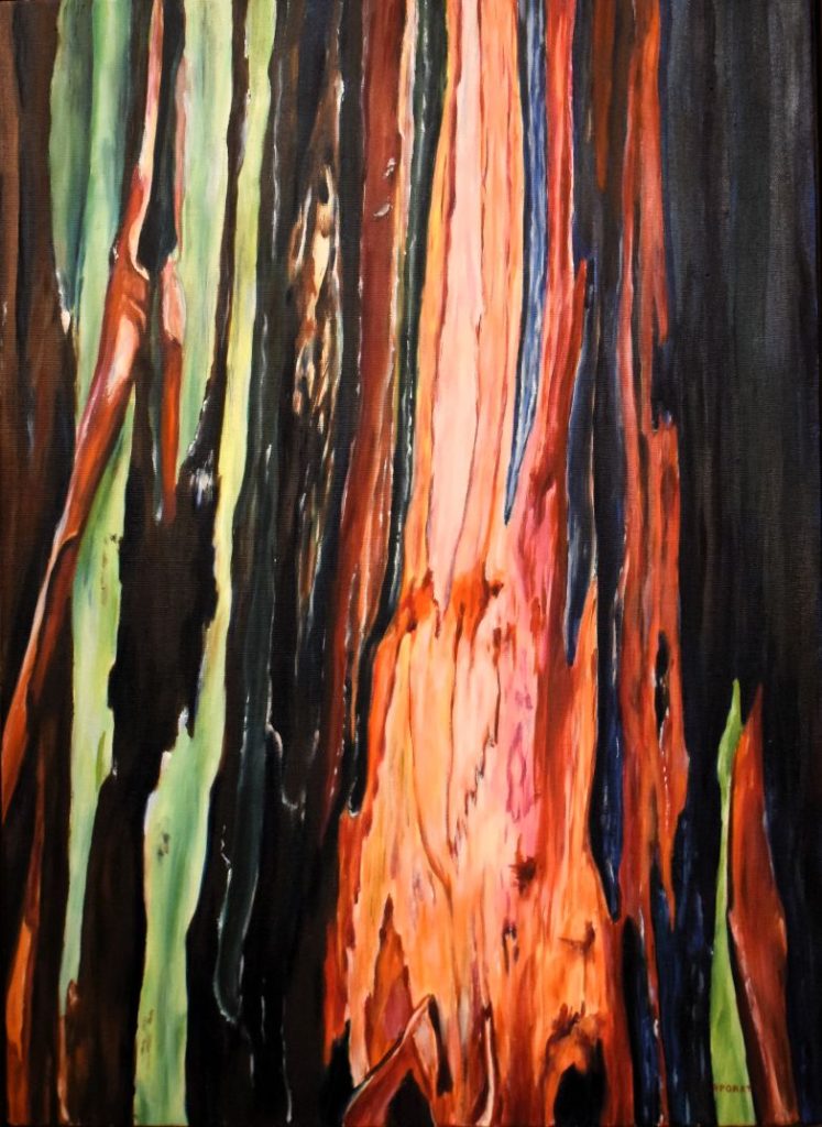 Gli “alberi” di Luisa Porporato sono sagome giganti che s’aggrappano fra loro, in un indomito desiderio di “resistenza” agli assalti di uomo e natura. I rami poderosi sono braccia nerborute che si fanno presa e sostegno comune, le cortecce giochi rigorosi e multiformi in cui sperimentare tutta la potenza di un segno minuto e perfetto nella sua inesausta forza di lineare creatività (così accurato e persistente tanto da creare ipotesi di forme e figure perfino inattese o occulte alla stessa artista), le radici “strette le une altre” portentosi ricami creati dalle nodose mani del tempo, impossibili da estirpare, solidi baluardi contro gli attacchi d’ogni turbine o tempesta. Il tutto immaginato e definito sempre dall’artista attraverso un linguaggio di netta e limpida e poderosa figuratività. Unica eccezione quei piacevolissimi “Frammenti di corteccia” (“Eucalipto Arcobaleno” o “Eucaliptus deglupta” famoso per la sua veste multicolore con striature verde brillante, blu, viola, arancioni e marroni e presente soprattutto alle isole Hawaii, in particolare sull’isola di Maui) dove le pagine di linea-colore paiono aprirsi a giochi decisamente più astratti, mai tuttavia perseguiti con particolare insistenza dall’artista.