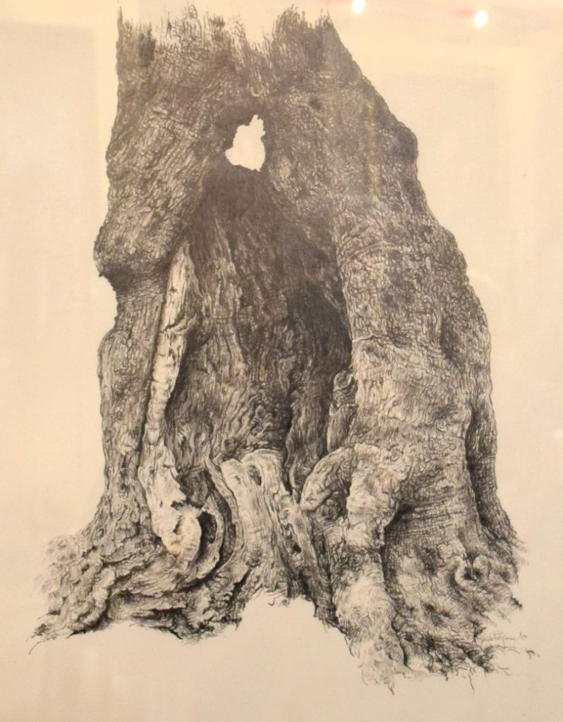E’ questo il mondo pittorico della Porporato, in mostra fino a sabato 9 maggio, al “San Gip” dei Fratelli delle Scuole Cristiane, con il titolo de “L’immagine del tempo: alberi” e la curatela di Angelo Mistrangelo. Che scrive: “Nel discorso della Porporato, gli alberi assumono da sempre una connotazione evocativa di incontri, percorsi e coinvolgenti scoperte attraverso viaggi , soggiorni e straordinari giardini con piante secolari e monumentali che sembrano affiorare da mitologiche letture”. E che possono richiamare, perché no?, il monumentale “Cipresso di San Francesco” (di circa 800 anni e alto 25 metri) situato nel Convento di “Santa Croce” nella riminese Villa Verucchio e nato, secondo la leggenda, dal bastone (“bordone”) piantato a terra dal Santo o, pur anche, per passare dal “sacro” al “profano”, al “letto nuziale” (Libro XXIII dell’“Odissea”) costruito da Ulisse, intagliandolo con le proprie mani da un ulivo ancora radicato nel terreno. E quanto quest’ultimo potrebbe ricordare “Accoglienza” o “Abbraccio secolare”, disegni graffiti su “carta Fabriano” di Luisa Porporato! Del resto il tema “alberi” si porta dietro e addosso secoli e secoli di grande storia dell’arte. Esempi certo noti all’artista torinese (dall’“Albero della vita” dai rami dorati e sinuosi di Gustav Klimt al “Mandorlo in fiore” di Vincent van Gogh fino alla serie dei “Pioppi” lungo le rive dell’Epte di Claude Monet o alla surrealista “La voix du sangue” di René Magritte), mai tuttavia letti con animo imitativo.