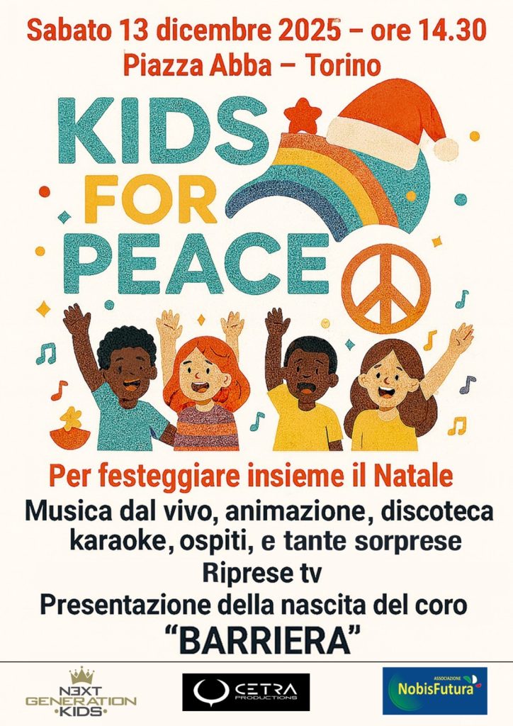 Nell’ambito dell’evento verranno presentati in anteprima live alcuni brani dell’EP di prossima pubblicazione che prende il nome dell’evento: “Kids for Peace”, vero e proprio manifesto musicale dell’evento e debutto di alcune delle voci soliste del coro “Barriera”, che interpreteranno brani da loro composti nell’ambito dei laboratori Next Generation Kids e Cetra, vedendo così premiato il loro impegno con la pubblicazione del proprio lavoro; unica eccezione dell’EP, la cover “Happy Xmas (War is over)”, quale inno alla pace e alla fratellanza tra i popoli, brano caratterizzante l’ispirazione dell’evento, che anticiperà la pubblicazione dell’EP in cui il coro “Barriera” figura tra gli interpreti insieme a Il Mito New Trolls, Johnson Righeira, Marco Ferradini, Danilo Amerio e Valentina Gautier.