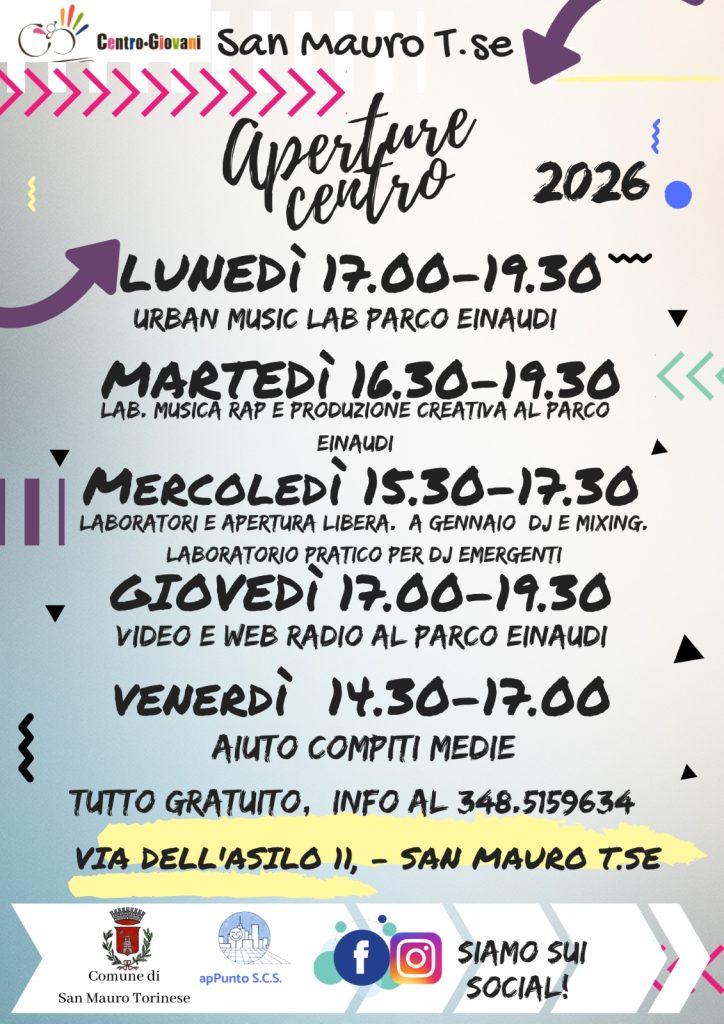 - Mercoledì (15.30 – 17.30) – Apertura libera (ping-pong, calciobalilla, giochi di società, chiacchiere e merenda). Musica per tutti: Laboratorio DJ e Mixing per imparare a usare vinili e software digitali e sviluppare creatività in ambito musicale.