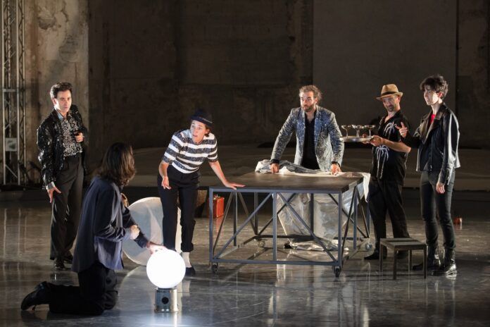Una cornice di avanspettacolo, forse di più trasandato baraccone alla festa del paese, un carico non trascurabile di comicità e ironia verso il mondo della scienza, un entertainer con la sua elegante giacca rossa di lustrini, un viaggio della memoria alla ricerca di un mondo scientifico, un capodanno futuribile, quello dell’anno 2035, che è più fine che inizio, l’antica filosofia dello spazio infinito e del tempo e il caos della loro costruzione, la testimonianza lontana del Big Bang, di quella palla distante e grigia che è la luna, la ricerca della poesia che facciamo fatica a veder arrivare. Tanto ogni azione è spezzettata, mai legata a quanto precede e a quella che la segue, 120’ difficili a scorgere, a recepire, ad assaporare (pubblico festante e osannante per molti versi, ma due signore nel corridoio d’uscita a confessarsi reciprocamente “guarda, io me ne sarei già uscita da un pezzo…”, con allure d’educazione, sabauda o no: e le espressioni che negano sono tante). Perché s’è notata, nell’intera serata, la difficoltà a inquadrare, tra grande fluttuare di veli, la filosofia temporale di Calvino che certo si guardò bene dallo scrivere per il teatro e qui svela tutta la fatica a essere imprigionato in un contenitore che gli sta davvero stretto. Che non è decisamente suo. Che poco o nulla ha a che fare con le sue pagine. Un progetto a lungo vagheggiato, una scommessa, decisa e composta in piena libertà, e rendiamo merito per il coraggio, ma persa, un filo rosso che è difficile rintracciare per collegare un inizio e una fine, un gran correre di tutti gli attori – che altro non fanno che inseguire quel gioco: diligenti Valentina Bellè, Federico Brugnone, Alissa Jung alias signora Marinelli, Fabian Jung, Gabriele Portoghese e Gaia Rinaldi – per la sala forse a voler rendere maggiormente partecipe il pubblico, farlo proprio, accalappiarlo festosamente, il cartello che invita agli “applausi” (non si sa mai!), la rappresentazione del gioco difficile da far collimare con quelle stesse pagine. Il nonsenso invade il palcoscenico, si parla anche di tagliatelle nello spazio, più che l’alto Calvino si scivola nel più frizzante Campanile. E tutto rimane lì, difficile da decifrare e da accettare.