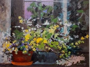 In linea d’arrivo, gli oli intensi, dal segno netto e dai colori accesi della carmagnolese Angela Panero, che ci parla di terre lontane, con storie di donne e uomini prigionieri da sempre di lavori e fatiche ataviche; a seguire, l’assordante visionarietà (“metafore universali”) della “pouring art” o “fluid art” di Luciana Pistone, per finire con i silenti scorci urbani, assordanti nel loro “nulla”, di Margherita Vaschetti, “perfetti campi cinematografici all’Antonioni”, mi sussurra il Rabbione, saggio critico cinematografico oltre che d’arte. Ed è proprio a lui che affido la toccante descrizione dell’ultima stanza “tutta per sé” (26 dipinti in parete), omaggio, a due anni dalla scomparsa, all’indimenticato Gianni Sesia della Merla: “Con l’aiuto delle figlie Rossana e Barbara, ho voluto rendere un omaggio, a quel grande artista e amico, che è stato Sesia della Merla, al tocco magico che usciva dalla sua tavolozza, ai paesaggi e alle ambientazioni, alla natura e ai vasti mercati orientaleggianti scoperti durante i viaggi, ma anche ai consigli, alle nostre chiacchierate pomeridiane, lui seduto sul divano di casa e io lì ad ascoltare il racconto di mondi che ancora adesso mi porto dentro”.