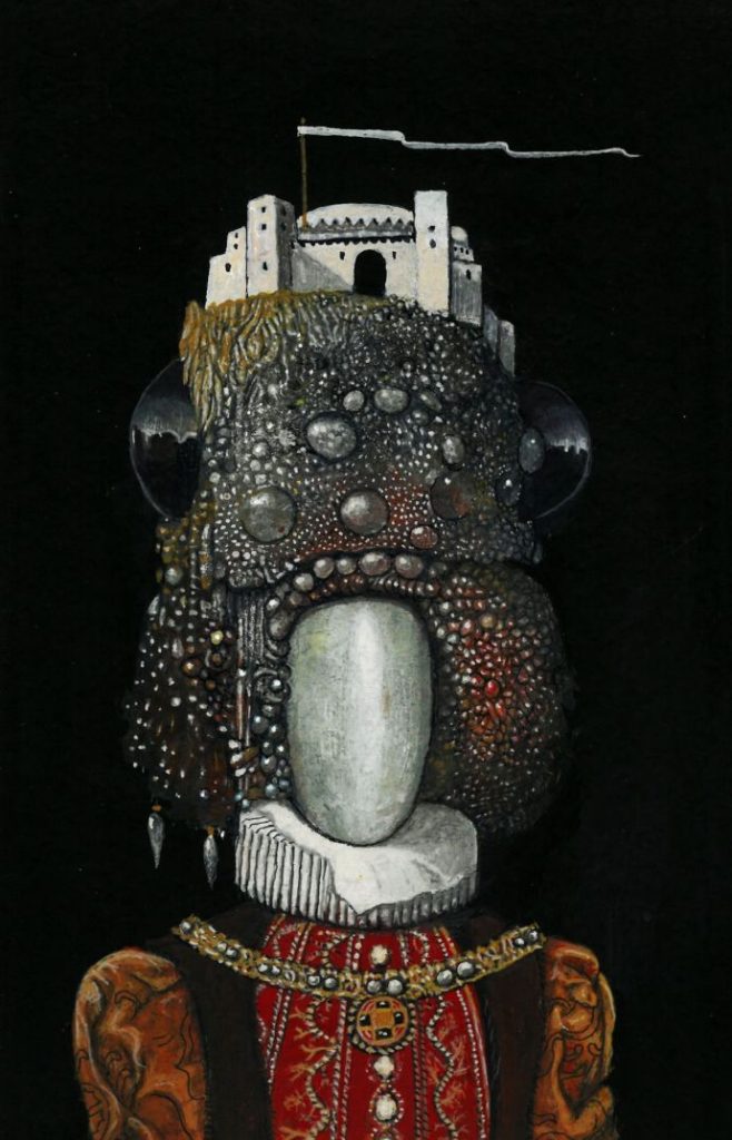 E poi, che dolce incontro quello con Anna Maria Palumbo (presente, deliziosa all’inaugurazione), con i suoi dipinti; acquerelli di un’infinita aggraziata lievità accanto ai suoi oli, agli acrilici e alle tempere di più robusta matrice cromatica in quel complesso intrecciarsi di boschi fogliame e fiori, dove può anche far breccia, per un birichino saluto, il vispo musetto di un micio in cerca di coccole. Un sorriso, ed eccoci fuori dal mondo reale con le “favole antiche” (“Fantasmagorie”) del biellese Fabio Cappelli. “Ritratti ricavati da una Storia antica e stralunata”, “personaggi improbabili”, di una certosina grafia segnica, “strampalati” nel prezioso minuto gioco di sovrapposizioni e intromissioni figurali capaci di farti emergere perfino (ed è pure poco) un “castello turrito” dal crine impreziosito di una nobil dama d’altri tempi.