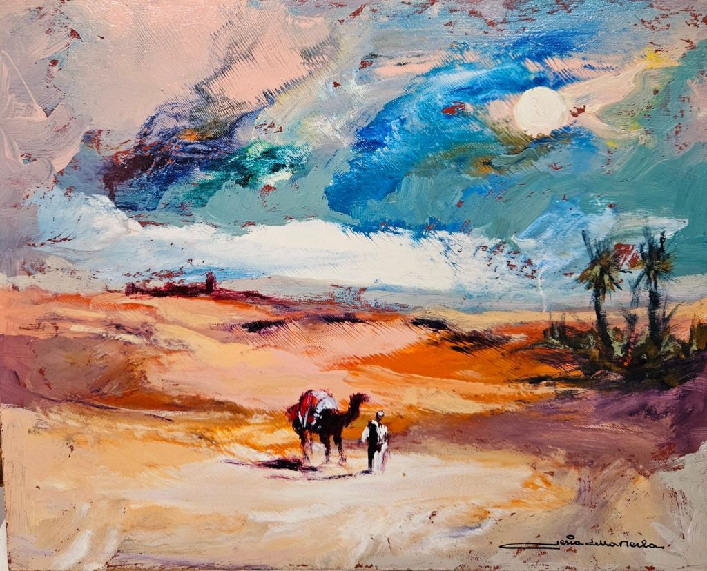 In linea d’arrivo, gli oli intensi, dal segno netto e dai colori accesi della carmagnolese Angela Panero, che ci parla di terre lontane, con storie di donne e uomini prigionieri da sempre di lavori e fatiche ataviche; a seguire, l’assordante visionarietà (“metafore universali”) della “pouring art” o “fluid art” di Luciana Pistone, per finire con i silenti scorci urbani, assordanti nel loro “nulla”, di Margherita Vaschetti, “perfetti campi cinematografici all’Antonioni”, mi sussurra il Rabbione, saggio critico cinematografico oltre che d’arte. Ed è proprio a lui che affido la toccante descrizione dell’ultima stanza “tutta per sé” (26 dipinti in parete), omaggio, a due anni dalla scomparsa, all’indimenticato Gianni Sesia della Merla: “Con l’aiuto delle figlie Rossana e Barbara, ho voluto rendere un omaggio, a quel grande artista e amico, che è stato Sesia della Merla, al tocco magico che usciva dalla sua tavolozza, ai paesaggi e alle ambientazioni, alla natura e ai vasti mercati orientaleggianti scoperti durante i viaggi, ma anche ai consigli, alle nostre chiacchierate pomeridiane, lui seduto sul divano di casa e io lì ad ascoltare il racconto di mondi che ancora adesso mi porto dentro”.