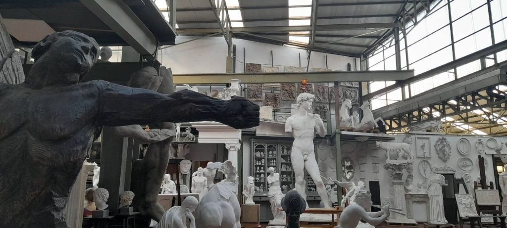 Rispetto ad un museo le statue non sono isolate su piedistalli, rischiarate liturgicamente da strategici led, ma condividono lo spazio con scale da muratore, secchi, stracci e tavoli da lavoro.