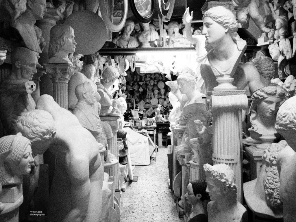 È un locale piccolo, e questo amplifica l’effetto scenografico dello tsunami vertiginoso di statue presenti, così vicine tra loro da condividere la stessa ombra.