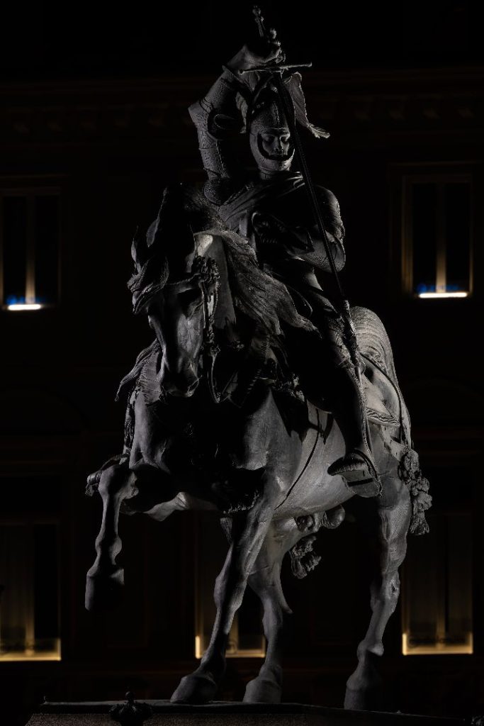 Una mostra che vuole, in certo senso, rammentarci e farci con più convinzione partecipi, dell’enorme importanza e ricchezza di quella “pubblica statuaria” che fa del nostro Paese e della nostra Città, in ampia misura, il “più grande museo a cielo aperto del mondo”. Il tutto grazie a “monumenti” e a “statue commemorative” che hanno attraversato i secoli, dall’Umanesimo (e molto prima ancora) al Rinascimento, per “trovare una straordinaria intensità espressiva nei decenni successivi all’Unità d’Italia”. A sottolinearlo, a ragion veduta, sono gli stessi curatori – in collaborazione con la civica Amministrazione – della mostra, Giovanni Carlo Federico Villa e Cristina Maritano (rispettivamente direttore e conservatore di “Palazzo Madama”), il cui lavoro è partito sollecitato, in modo particolare, dalla “capillare campagna fotografica” condotta dal torinese Giorgio Boschetti che, attraverso i suoi visionari scatti notturni (quasi spettri formali scolpiti nei loro tratti di maggiore ed emotiva intensità) riescono alla perfezione non solo a “documentare”, ma a “riattivare” spazi mnemonici da tempo “in disuso”, trasformando la città in un vero e proprio “Teatro della Memoria”. Immagini suggestive, firmate da un vero “poeta” dello scatto, cui fa riscontro l’imponente “mappa di Torino” realizzata a “china su carta” dall’architetto Alessandro Capra, dove (secondo un suo singolare modus operandi) la “veduta zenitale” del cuore antico della città, incentrata su piazza Castello e su Palazzo Madama, lascia gradatamente il posto a una “veduta a volo d’uccello”, che termina all’infinito meridiano sul Monviso. Nella fitta rete di vie e di piazze che compongono il tessuto urbano, si collocano i 79 monumenti pubblici di Torino, numerati in pianta e rappresentati ad uno ad uno in singole formelle lungo i bordi, così da consentire a chi guarda di cogliere l’insieme dei monumenti e la loro distribuzione sul territorio.