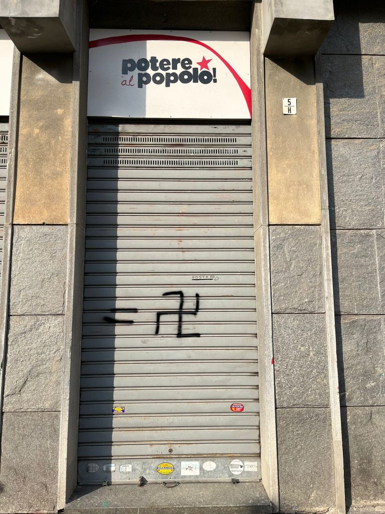Nei giorni scorsi la nostra serranda è stata sfregiata con una svastica da alcuni sionisti che ci volevano associare ai nazisti. Ebbene, lo ripetiamo per l’ennesima volta: oggi essere antifascisti significa essere antisionisti, significa essere contro l’idea che qualcuno abbia il diritto di sterminare, violentare, devastare terra e vita di altri. Per questo sosteniamo la lotta per la libertà e l’autodeterminazione del popolo palestinese, per questo contrastiamo ogni rigurgito nazista e fascista affinché gli orrori della storia non si ripetano.