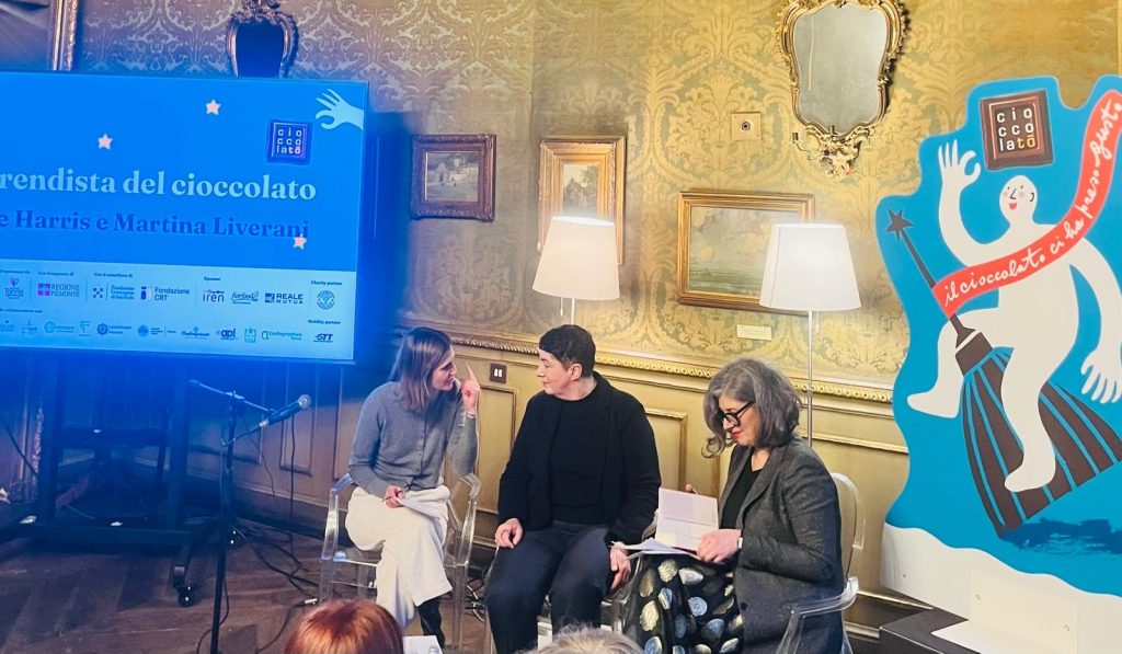 Accolta da un pubblico numeroso e partecipe, Harris, in dialogo con Martina Liverani de Il Gusto, ha subito sottolineato il suo legame speciale con Torino e con i lettori italiani, ricordando come l’Italia sia stato il primo paese a credere in Chocolat. Il romanzo fu pubblicato dagli editori italiani sei mesi prima rispetto al Regno Unito e agli Stati Uniti, in un momento in cui quelli anglosassoni faticavano ancora a comprenderne la natura. Non era chiaro se si trattasse di realismo magico, di una storia d’amore o di un romanzo gastronomico; in Italia, invece, il libro venne accolto semplicemente per ciò che era: un racconto che intreccia maternità, famiglia, chiesa e cioccolato. Un successo editoriale straordinario, poi amplificato dalla trasposizione cinematografica con Juliette Binoche e Johnny Depp, che ha contribuito a fissare Chocolatnell’immaginario collettivo.