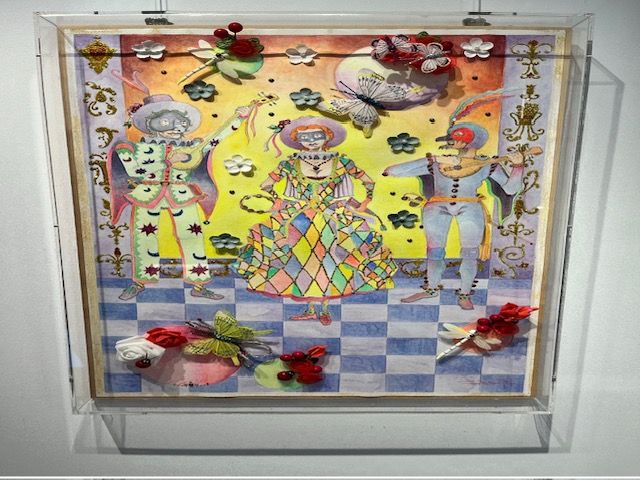 Non soltanto opere su carta e colori riempiono il mondo surreale di Gissi. In piccole vetrine della “Malinpensa” un “Papillon” (2022), scultura polimaterica, raccoglie stoffe ricamate e bottoni rossi, ali argentate, nastri e cordoncini colorati, fili di ferro intrecciati, come un “rock and roll robot” (2023), con tanto d’antenne e lampadine, orologi attaccati sul petto, rivestimenti d’argento e tappi, cuoricini rossi e perle, come il giullare, agghindatissimo, che è diventato “Mister Buffo”, tanto per rivisitare un titolo teatrale. Mondo teatrale che non dimenticate d’osservare con attenzione, prima d’uscire dalla galleria: quei “Saltimbanchi alla corte dei Gonzaga” (2024), vera e propria scenografia, la luna e il castello, le maschere e i pupazzi, la piccola giostra, i pezzi degli scacchi disseminati, le stoffe e l’ordine delle passamanerie e il mappamondo impugnato: tutto è sotto i nostri sguardi, per il vero trionfo della fantasia.
