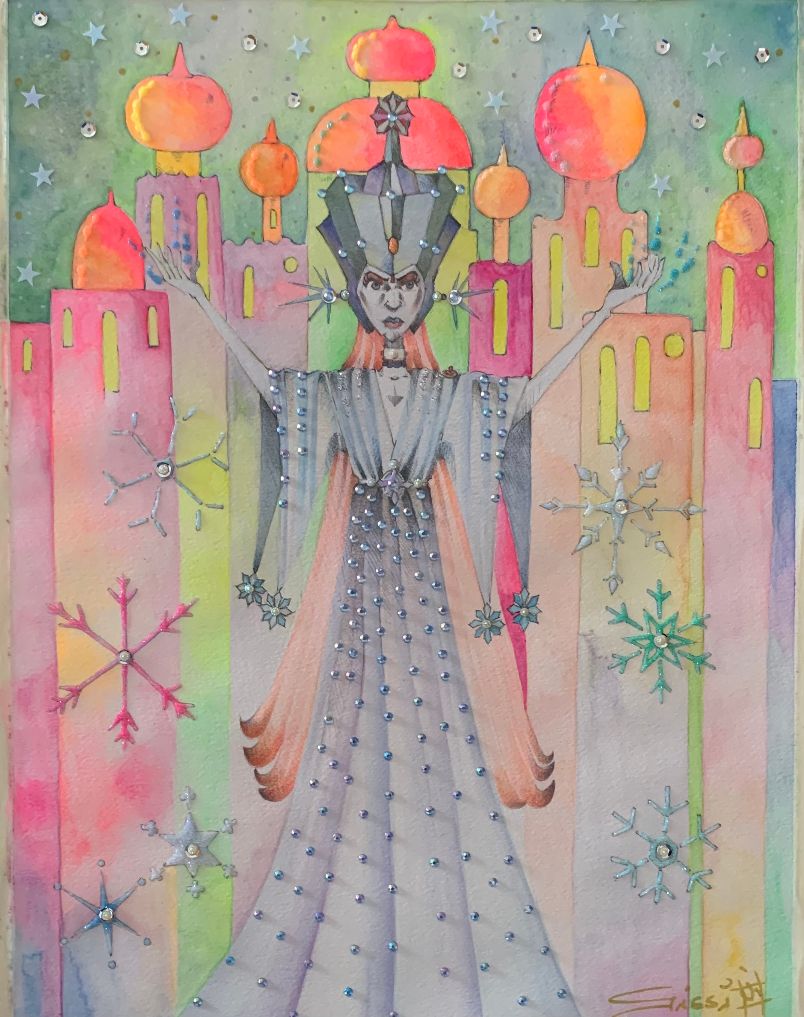 È un linguaggio tutto suo proprio quello che Gissi esprime, costruttore di una poetica divenuta immediatamente riconoscibile, che esige una ricerca continua e che oggi sfocia in Prospettive luminose, mostra e luogo dove pare che quel mondo della favola si renda realtà, tangibile e curiosa, “dove ogni colore e forma diventano finestre su mondi inattesi e immaginari”. Colombina e le altre maschere allineano la bellezza dei costumi e sovrapposizioni di materiali, le eterne farfalle che sono il marchio dell’autore e insetti, ciliegie e ricami, stelle e fiori, mentre guardano a un Sandokan la cui ironia raccoglie divertenti animali della giungla, con tanto di “fumetti” pericolosi (un improvviso “roar”), che sembrano guardare al divertimento di Jacovitti. Il Joker produce prodezze su una palla colorata e tra carte che svolazzano (“I’m going slightly mad”, 2021), mentre in “The Sicily’s Theater” i campioni della “Gerusalemme” vestono, all’interno di un sipario rosato, la precisione delle loro multicolori armature, tra elmi e scudi e spade, lasciandosi alle spalle le tende dell’accampamento. Luogo spesso rivisitato, Gissi con grande inventiva, dando spazio alla protagonista o concentrandosi maggiormente ai suoi compagni di viaggio, ci introduce al magico mondo del reverendo Carroll o con ricchezza di particolari ci mostra il divertente “Capitan Nemo” (2025), una macchina futuribile a forma di pesce, labbroni color arancio e tenaglie e luci di direzione e pinne mentre in disparte un granchio antropoformizzato pare il giamaicano Sebastian della “Sirenetta”.