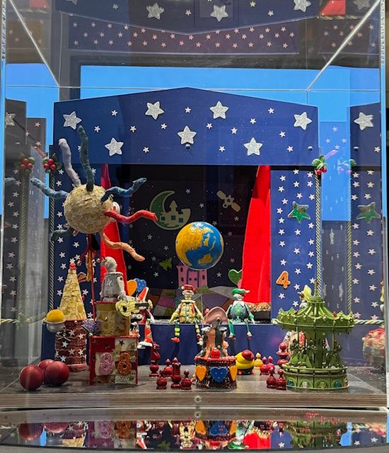 Non soltanto opere su carta e colori riempiono il mondo surreale di Gissi. In piccole vetrine della “Malinpensa” un “Papillon” (2022), scultura polimaterica, raccoglie stoffe ricamate e bottoni rossi, ali argentate, nastri e cordoncini colorati, fili di ferro intrecciati, come un “rock and roll robot” (2023), con tanto d’antenne e lampadine, orologi attaccati sul petto, rivestimenti d’argento e tappi, cuoricini rossi e perle, come il giullare, agghindatissimo, che è diventato “Mister Buffo”, tanto per rivisitare un titolo teatrale. Mondo teatrale che non dimenticate d’osservare con attenzione, prima d’uscire dalla galleria: quei “Saltimbanchi alla corte dei Gonzaga” (2024), vera e propria scenografia, la luna e il castello, le maschere e i pupazzi, la piccola giostra, i pezzi degli scacchi disseminati, le stoffe e l’ordine delle passamanerie e il mappamondo impugnato: tutto è sotto i nostri sguardi, per il vero trionfo della fantasia.