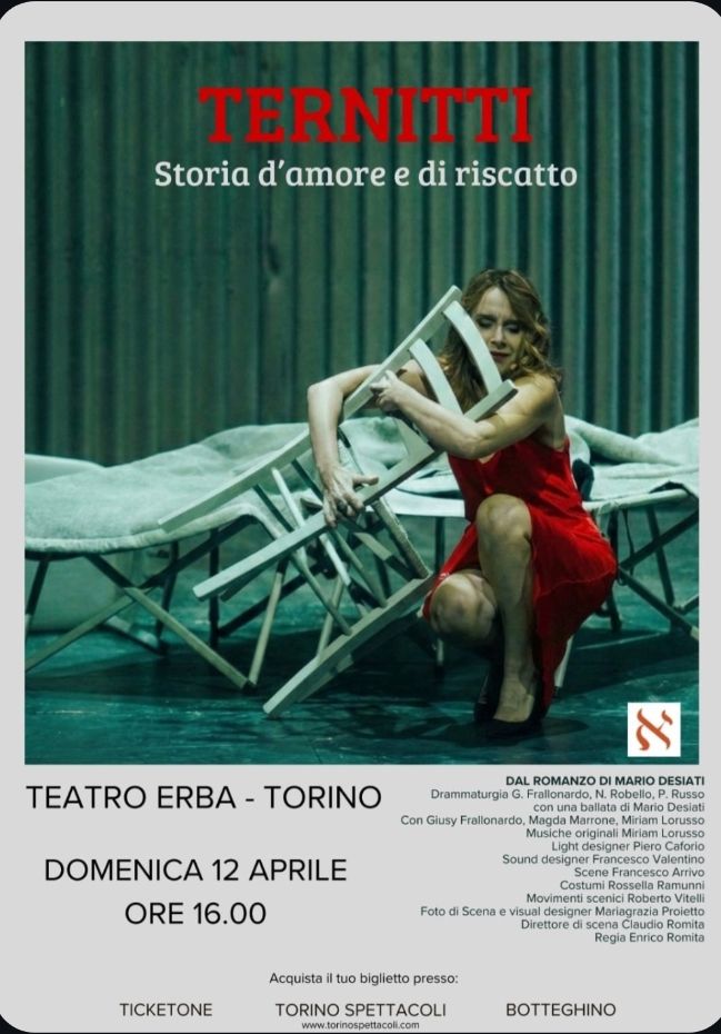 Domenica 12 aprile, alle ore 16, presso il teatro Erba di Torino, andrà in scena la pièce teatrale “Ternitti-Storia d’amore e di riscatto”, tratto dal romanzo di Mario Desiati finalista al Premio Strega 2011. La regia è curata da Enrico Romita, in scena Giusy Frallonardo, Magda Marrone e Miriam Lorusso, che firma anche le musiche originali. I costumi sono di Rossella Ramunni, il direttore di scena è Claudio Romita.