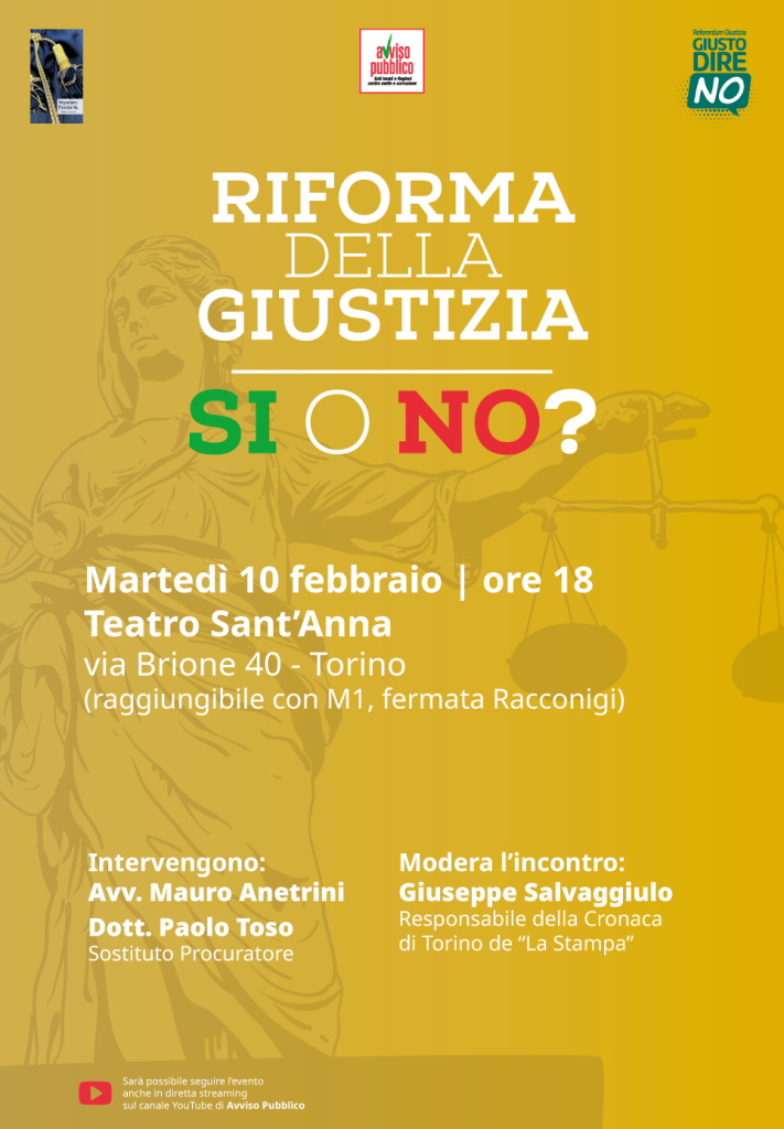 Martedì 10 febbraio, alle ore 18, presso il  Teatro Sant’Anna, in via Brione 40, a Torino (raggiungibile con M1, fermata racconigi), si svolgerà un incontro dal titolo “Riforma della Giustizia: si o no?”.
