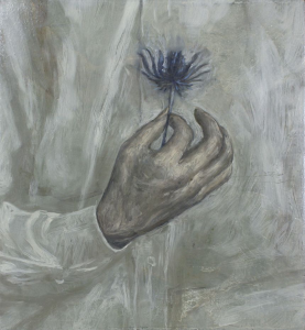 In tal senso, é da leggersi la pittura di fragile realismo, pur nella tecnica di perfetta definizione, di Riccardo Albiero. Figura ascetica, le braccia lungo i fianchi, una postura composta in silente, intima preghiera nel suo fisso osservarci quali amichevoli presenze cui chiedere gesti di comune devota condivisione, quella del giovane (autoritratto?) dallo sguardo profondo e penetrante di “The Silent Choir”. Alle sue spalle un “telo sospeso” (quasi sipario teatrale) in cui vediamo muoversi “ombre di colombe in volo” (simbolo eterno di pace cristiana e riconciliazione divina), riflesse in un gioco di smosso chiaro-scuro nell’ampia camicia chiusa ai polsi, fiori appena accennati nella delicatezza di morbide cromie e un “cardo” disegnato in basso a sinistra. Il volto del giovane “non descrive un’ identità definita–sottolinea Irene Finiguerra – ma una presenza interiore, come una figura che affiora come memoria dell’anima, come tracce di un mistero che non si lascia afferrare ma solo intuire”. E mistero, realtà simbolica è ancora il “cardo” che si ripete da “The Silent Choir” al più piccolo “Sorrowful Charm”, dove appare tenuto in mano forse dallo stesso giovane del precedente dipinto. Anche qui, non semplice grafica ornamentale di una comune “pianta” erbacea, ma, in ambito religioso, elevato simbolo associato al dolore, alla corona di spine e alla passione del Cristo, del Cristo che si fa uomo e assume su di sé la maledizione della Genesi per redimere l’umanità. Ancora Irene Finiguerra:“Queste opere parlano a chi crede, ma anche a chi è in ricerca. A chi riconosce nel tempo pasquale un mistero di fede e a chi, semplicemente, attraversa la Cattedrale in cerca di silenzio. Non chiedono appartenenza, ma disponibilità all’ascolto. In un tempo spesso segnato dal rumore e dalla fretta, invitano a sostare senza difese, a lasciarsi toccare da una luce che non impone risposte ma apre domande. Fino a giugno, nel tempo disteso che segue la Pasqua e conduce verso la pienezza della luce estiva, queste immagini continuano a parlare di vita che rinasce e di presenza che si fa discreta. Non proclamano, non spiegano: accompagnano. Sono come preghiere mute affidate alla pittura, offerte silenziose che chiedono soltanto di essere accolte”.