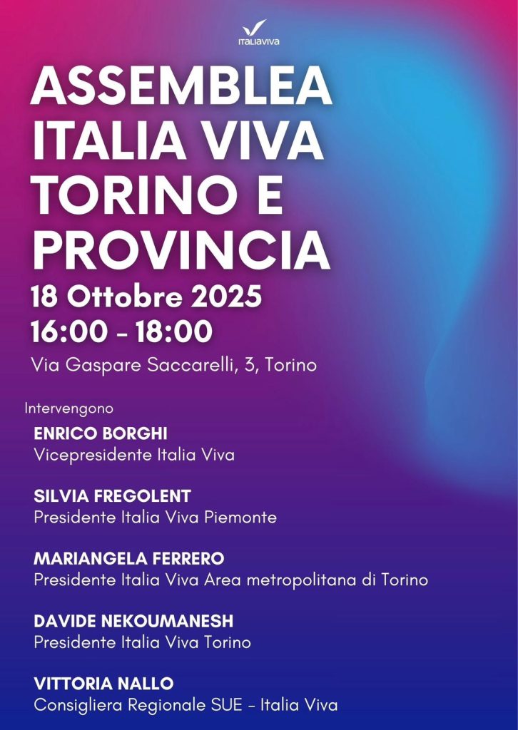 L’assemblea di Italia Viva Torino e provincia si terrà sabato 18 ottobre alle ore 16 in via Saccarelli 3, Torino.