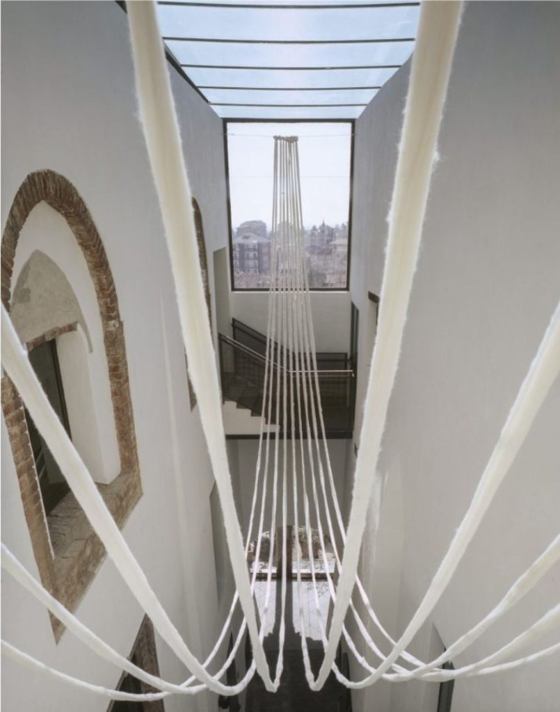 La mostra al Castello di Rivoli consiste in una nuova commissione ideata da Vicuña per la Manica Lunga. Appositamente progettata per gli spazi longitudinali dell’edificio, l’opera è immaginata dall’artista come un “quipu acostado”, installazione sospesa a più altezze appartenente alle antiche civiltà andine, e poi ampiamente utilizzati dagli Inca, i “quipu”, (nodi in lingua Quechua), che consistono in corde annodate, utilizzate come sistema di registrazione di informazioni, tra cui dati di carattere amministrativo, astronomico, ma anche storico e narrativo. I “quipu” contemporanei di Vicuña diventano installazioni ambientali coinvolgenti che attraversano lo spazio e il tempo. Per produrli, l’artista utilizza lane crude e grezze che svolge e assembla realizzando delle sorprendenti architetture aeree. Nella Manica Lunga del Castello, il nuovo “quipu” “El glaciar ido / The vanished glacier” rappresenta la presenza evocativa della transitorietà, dello scorrere del tempo, del movimento di elementi naturali come ghiaccio, acqua e vento, e dell’impatto umano sull’ambiente. La natura dell’opera è partecipativa, ed essa è un elemento fondamentale che permette al lavoro di diventare tessitore di persone e luoghi; Vicuña ricerca la relazione con l’acqua quale memoria degli antichi ghiacciai ormai estinti, che un tempo caratterizzavano il paesaggio della Valle di Susa, dove è collocato il Castello.