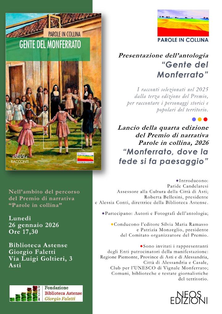 Paesaggio collinare dai mille volti e di infinita delicata bellezza, quello delle province di Asti e di Alessandria, non è solo realtà di poggi, vigne, boschi e borghi o città ricche di presenze umane e architettoniche che sono lasciti di antiche Storie e del trascorrere millenario dei tempi, ma anche luogo di profonda devozione in cui fede, arte e paesaggio s’intrecciano sotto forma di chiese, pievi, cappelle, monasteri, santuari, sinagoghe e templi, quali “simboli del mondo invisibile ed importante della spiritualità di questa terra”. Di qui l’idea del nuovo tema, i “luoghi di devozione” del Monferrato, su cui sono oggi invitati ad ispirarsi gli autori che aderiranno all’invito di “Parole in collina 2026”, la cui quarta edizione, “Monferrato, dove la fede si fa paesaggio”, verrà lanciata lunedì prossimo 26 gennaio (ore 17,30) presso la “Biblioteca Astense Giorgio Faletti” di via Luigi Goltieri 3, ad Asti. Nel corso dell’evento sarà anche presentata l’Antologia “Gente del Monferrato”, pubblicata da “Neos Edizioni”, che raccoglie i 20 racconti selezionati in occasione della terza edizione del “Premio”, nel 2025. Fra tutte le storie dell’Antologia, saranno in particolare riprese le tre che narrano vicende legate alla “Shoah”, in occasione del “Giorno della Memoria”, celebrato il prossimo martedì 27 gennaio.