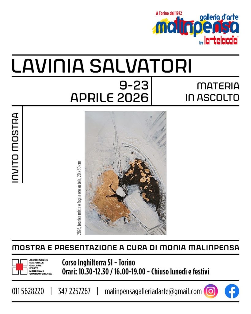 Lavinia Salvatori, in mostra insieme all’artista Marco Palma alla galleria d’arte Malinpensa by la Telaccia, manifesta un’intensa propensione alla comunicazione di contenuti psicologici costanti rivolti al fruitore. Le sue opere, generate da una profonda essenza emotiva, sono capaci di suscitare nell’osservatore un’immediata partecipazione. Le rappresentazioni si configurano come segni espressivi di una creatività astratta e informale in grado di raggiungere risultati di notevole equilibrio strutturale e di rilevante valore cromatico. Spazi, volumi e superfici si articolano all’interno dell’opera in una stesura tecnica importante, dove la stratificazione materica diventa veicolo dell’identità più autentica dell’artista. Il processo creativo di Lavinia Salvatori si distingue per il suo lessico pittorico raffinato, capace di trasmettere emozioni e sensazioni continue, elementi fondanti del suo percorso espressivo. La struttura dell’opera si fonda su un ritmo compositivo intenso in cui segni, campiture e tensioni formali si organizzano secondo una logica dinamica e contemporanea. L’equilibrio nasce dal dialogo costante tra ordine e impulso, tra controllo e libertà espressiva, generando una superficie pittorica carica di energia e di comunicativa. Ne deriva un impianto moderno capace di integrare capacità prospettica, movimento e l’articolazione volumetrica sempre in una sintesi visiva aperta e vitale. Nella tecnica mista su tela, l’artista Lavinia Salvatori fonde la materia della tempera con la luminosità del bianco assoluto, generando una purezza formale intensa. Nelle ultime opere, questo approccio si è ulteriormente evoluto: accanto all’uso della foglia oro su tela, emergono gestualità incisive di nero, oltre a un raffinato decorativismo floreale dei dettagli, che conferiscono forza, ritmo e ricchezza compositiva. La superficie pittorica diventa così un campo di sperimentazione in cui colore e segno dialogano tra loro, offrendo una prospettiva nuova e intensa capace di combinare energia espressiva in un perfetto ascolto con la materia. Attraverso una gestualità intensa, carica di sentimento e di spiritualità, l’opera si presenta luminosa e aperta a un‘autonomia interpretativa. Il dinamismo del gesto e l’uso del colore, uniti a una ricca stratificazione culturale, svolgono un ruolo centrale in una ricerca esecutiva originale e in continua evoluzione. L’impegno tecnico e materico, l’attenzione alla luminosità del bianco e al rapporto tra forma e spazio, definiscono una pittura autentica e originale in cui il colore si carica di valore simbolico e oscilla tra rigore formale e tensione espressiva. Lavinia Salvatori giunge così a una sintesi stilistica personale che costruisce immagini simboliche e narrazioni autonome.