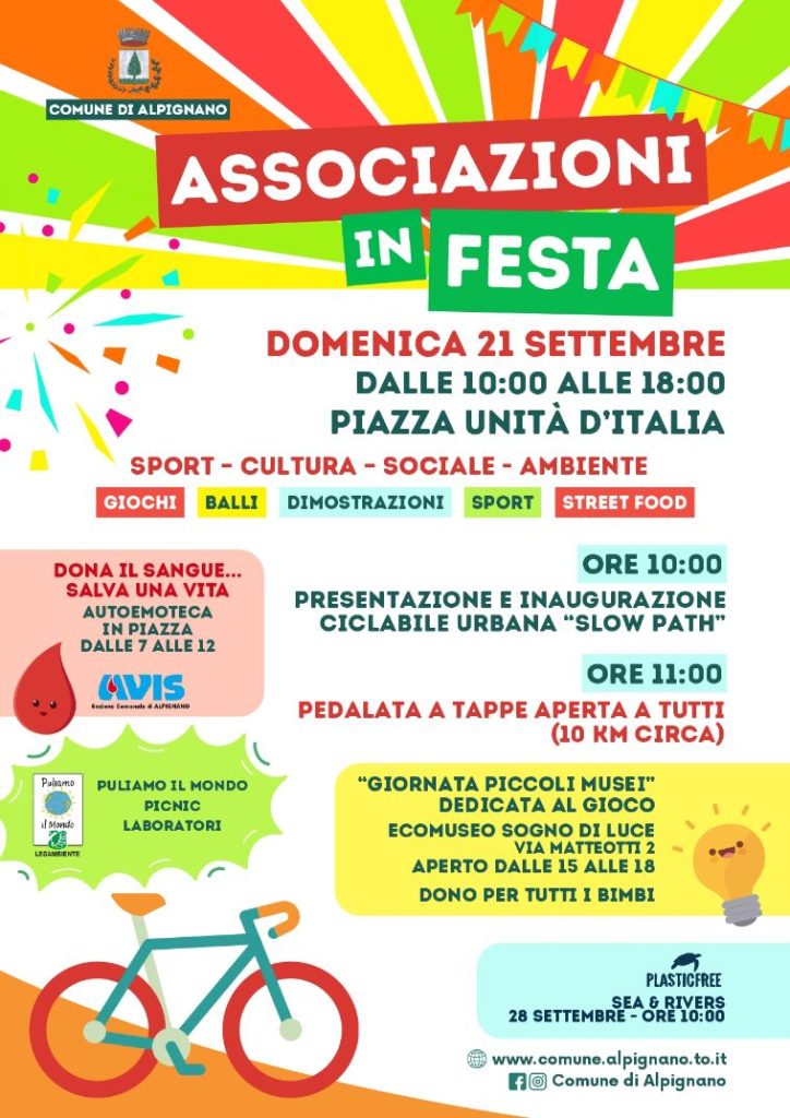 Torna ad Alpignano l’appuntamento “Associazioni in festa” domenica 21 settembre, in piazza Unità d’Italia. Una quarantina d’associazioni animeranno la piazza dalle 10 alle 18 con musiche, balli, giochi, sport, esposizioni e dimostrazioni, tutte attività proposte dai volontari che, senza voler nulla in cambio, mettono a disposizione per il bene della Città. Un’occasione per trovare nuovi spunti per il tempo libero o per il proprio impegno sociale o, ancora, sperimentare nuove discipline sportive. Al mattino si partirà armati di kit di pulizia con “Puliamo il mondo” e, subito dopo, il corso di educazione ambientale con gli educatori di Cascina Govean Lega Ambiente. Alle 10 presentazione della pista ciclabile urbana “Slow Path”. Per l’occasione sarà visibile una mostra sulla storia della ciclabile. Alle 11 partenza per la pedalata aperta a tutti su asfalto e sterrato, in collaborazione con il CAI di Alpignano. Le iscrizioni avverranno a partire dalle ore 10 presso lo stand del Comune. Due saranno i percorsi, il primo semplice di 8 km circa e uno per esperti, di 17 km circa. Si partirà tutti insieme da piazza Unità d’Italia alle ore 11.